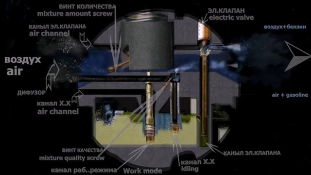 Карбюратор-Анимация работы Х.Х.Видео на примере карбюратора #скутера с #двигателем #2т.показана работа запуска холодного двигателя---смесь поступает через верхний канал эл.клапана прогрева +с канала Х.Хода.\рабочий режим отдыхает\. после прогрева вращаем газульку-открывается дроссель ,двигатель переходит в рабочий режим и смесь будет поступать с главного жиклера-этод режим будет показан в следующем видео..