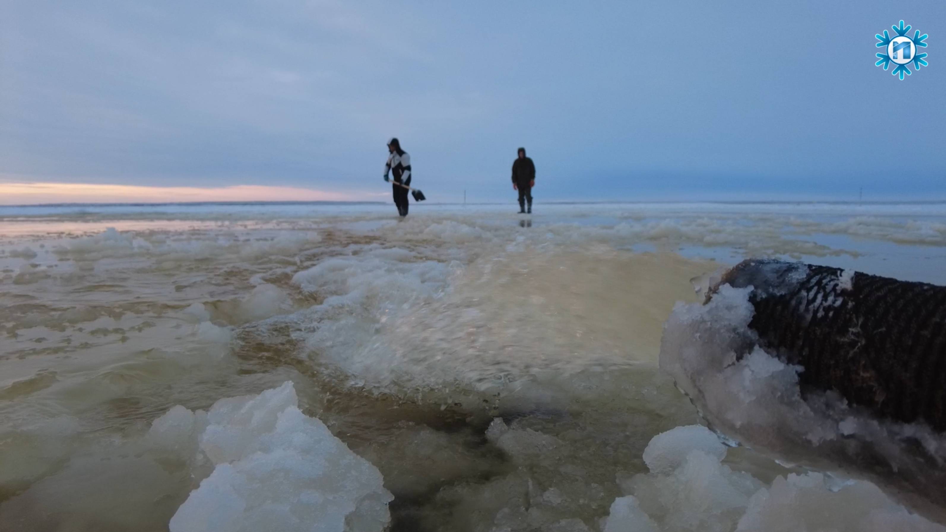 Дорожники намораживают лед на Большой Оби в районе села Горки.