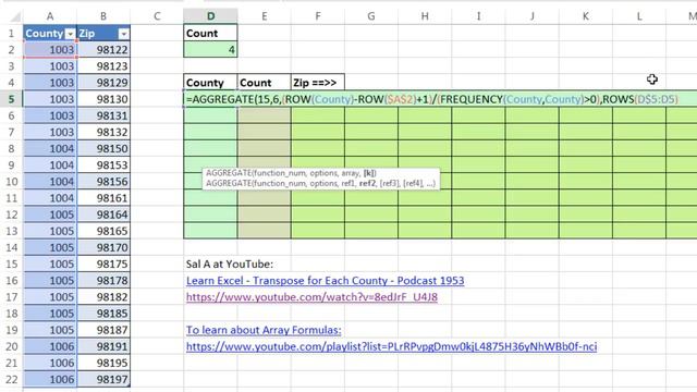 Download Excel Start File: https://excelisfun.net/files/EMT1190.xlsx Download File: https://excelisfun.net/ See how take two columns of county numbers and kip codes and show unique list of county codes vertically, and then for each county code, list zips codes horizontally. 1. (00:08) Problem Set up 2. (00:50) Why use formulas and why use Array Formulas 3. (01:20) Beauty of formulas is that they update instantly when the source data changes 4. (01:36) Convert Data Set to Excel Table so that we have dynamic ranges that will allow formulas to update automatically when we dump new data into table. 5. (02:26) Use Defined Names rather than Table Formula Nomenclature (Structured References) 6. (02:42) Create Names From Selection keyboard: Ctrl + Shift + F3 7. (03:09) Test to see if Defined Names will respect expanded ranges in an Excel table. 8. (03:32) SUMPRODUCT and FREQUENCY functions to create a Array Formula that counts unique numbers 9. (06:55) Array Formula to extract a unique list of numbers, using the functions: IF, ROWS, ROW, INDEX, FREQUENCY, AGGREGATE 10. (13:31) IF and COUNTIFS to count how many of each county codes there are. 11. (14:29) Formula to extract zip codes and list horizontally (that depends on the county codes being sorted) using IF, OR COLUMNS, INDEX and SUM functions. Also see some expandable ranges in the formula. This is not an array formula – and we can use it because the county code column is sorted. 12. (20:22) Test the solution by dumping a new data set into the Excel Table to see that the formulas all update instantly. 13. (20:49) Summary Sal A at YouTube: Learn Excel - Transpose for Each County - Podcast 1953 https://www.youtube.com/watch?v=8edJrF_U4J8 To learn about Array Formulas: https://www.youtube.com/playlist?list=PLrRPvpgDmw0kjL4875H36yNhWBb0f-nci Excel Magic Trick 1190: Formulas To Extract Unique List County Numbers & List Zip Codes Horizontally playlist: https://www.youtube.com/playlist?list=PL63A7644FE57C97F4