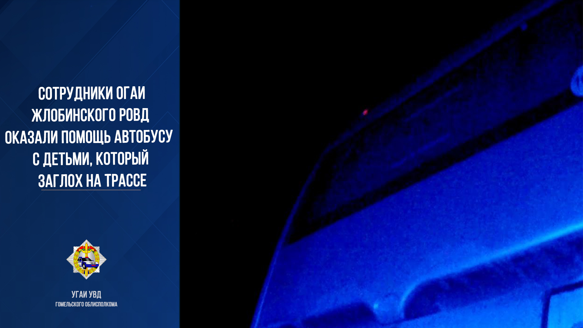 7 января 2022 года примерно в 4:00 в дежурную часть ОГАИ Жлобинского РОВД поступило сообщение, что на 222 км автодороги М- 5 «Минск-Гомель» поломался автобус, в котором находятся 45 человек, из них в основном все дети. Правоохранители незамедлительно выехали на указанный участок дороги для оказания помощи. Поскольку на улице в тот момент было достаточно морозно и погодные условия оставляли желать лучшего, сотрудники ГАИ принялись максимально быстро принимать меры, чтобы как можно скорее автобус с детьми продолжил дальнейшее движение. «Прикурить» транспортное средство не представилось возможным, поскольку в автобусе бортовое питание 24 вольт, а в служебном автомобиле – только 12. Тогда один из правоохранителей стал обзванивать дорожные службы в поисках грузовой техники, которая помогла бы завести автобус, а второй – контролировал безопасность на дороге и принимал меры найти помощь среди проезжающего транспорта. К счастью, по трассе в этот момент ехал большегруз, водитель которого вызвался помочь. С помощью пусковых проводов удалось запустить двигатель автобуса, и он смог начать свое движение. Транспортное средство доехало в препровождении сотрудников ГАИ с включенными маячками синего цвета до ближайшей автозаправочной станции, где все вместе ожидали прибытие исправного автобуса. В виду того, что на территории Гомельской области по-прежнему погодные условия оставляют желать лучшего, всегда помогайте друг другу и не проезжайте мимо тех, кто оказался в тяжелой ситуации! Госавтоинспекция придет на помощь всегда, но и Вы ни в коем случае не проявляйте равнодушия к нуждающимся в помощи людям!