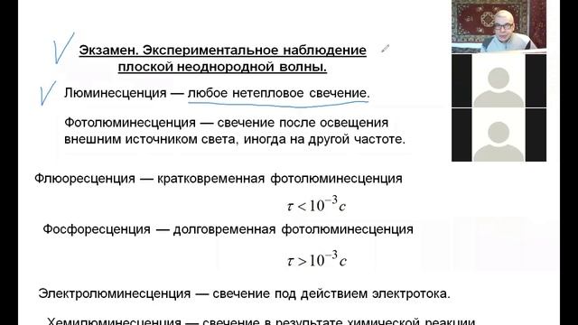 9 лекция, часть 4, Оптика, СПбГУ, 2021, Крылов И. Р., плоская неоднородная волна при полном внутреннем отражении света (окончание), люминесценция света.