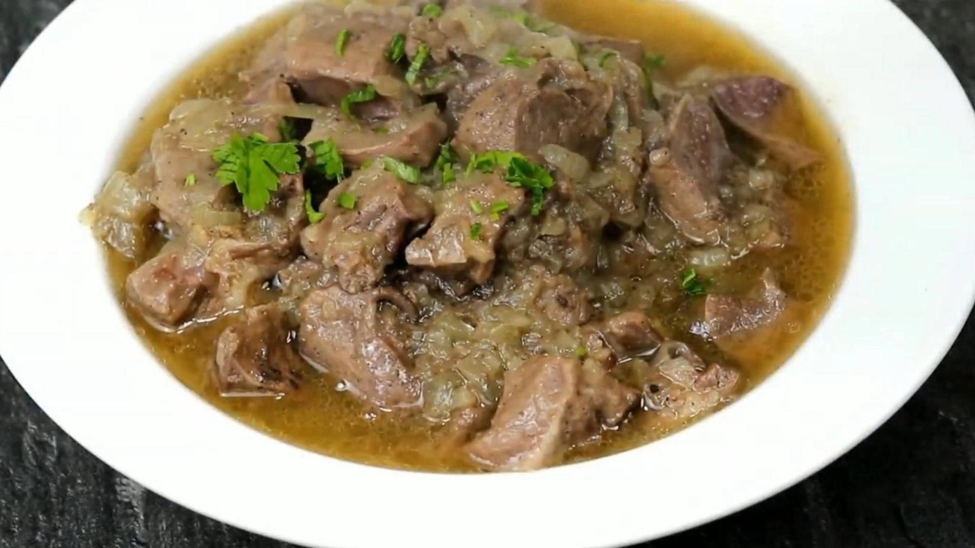 Рецепт: Лук - 2 шт Сердце свиное - 700 г Растительное масло - 4 ст.л. Лавровый лист - 2 шт Соль Смесь перцев Вода - 400 мл Петрушка