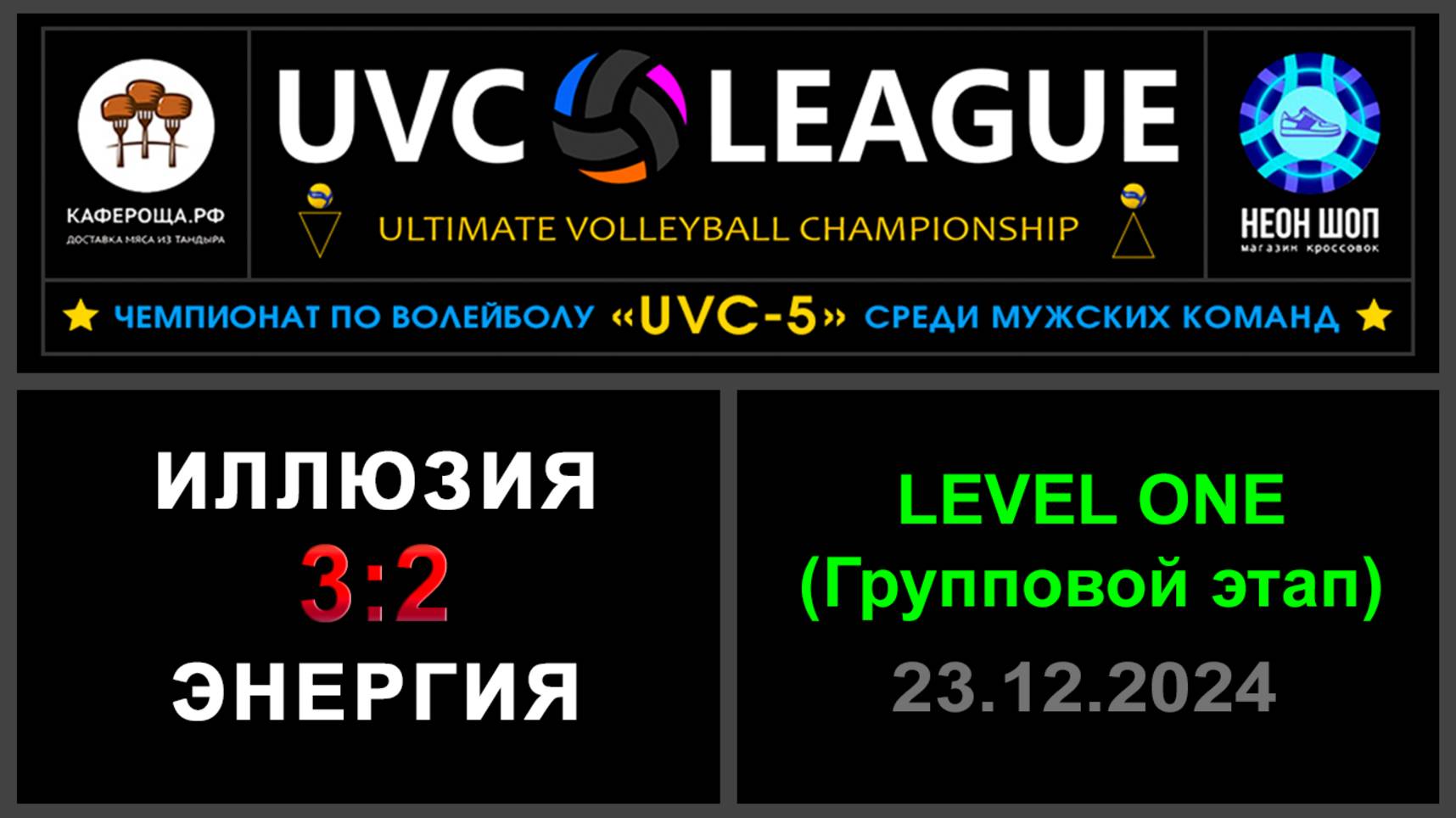 UVC-5 (Мужчины): Чемпионат UVC Лиги по волейболу среди мужских команд, 2024-2025 гг. Результаты игры: LEVEL ONE (Групповой этап) 23.12.2024 Иллюзия - Энергия 3:2 (24:26, 25:27, 25:16, 25:22, 15:13) Конкурс «Робин Гуд»: ⛔Точных попаданий не было! #UVC_ЛИГА_ЧЕМПИОНАТ_UVC_5_Мужчины