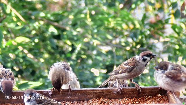 Воробьи в кормушке летом