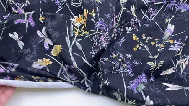 Трикотаж чёрного цвета с принтом полевые цветы, стрекозы 38248