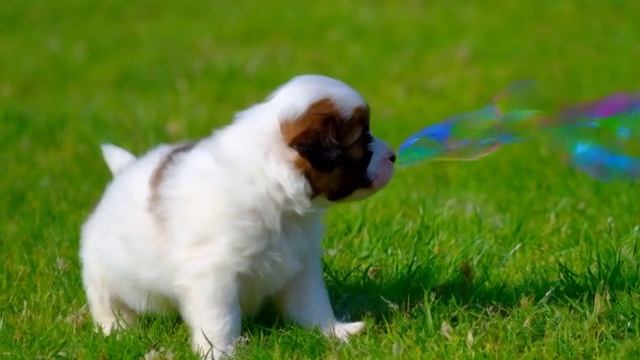 Маленький щенок ловит мыльные пузыри