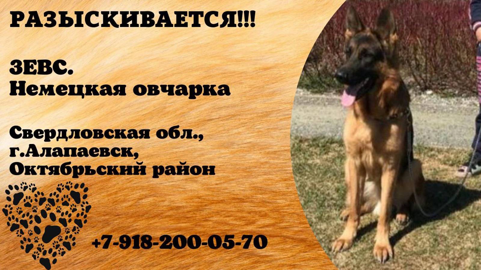 Свердловская Алапаевск Пропала собака потеряшка вознаграждение 100.000 руб ‼️ Убежал еще в октябре -ноябре 2023 в октябрьском районе г. Алапаевска. Кобель немецкая овчарка, крупный , длинный, 5 лет, откликается на имя Зевс , возможно кто то взял его себе , или располагает какой то информацией . Пес нам очень дорог, мы не теряем надежды найти Зевса. Собаку ищет первая хозяйка, которая по семейным обстоятельствам была вынуждена оставить собаку знакомым. Регулярно она его навещала и отмледивала судьбу. И вот только недавно узнала о том что он был отдан в другие руки и оттуда уже сбежал. Как выяснилось новый хозяин его не ищет. Люди помогите пожалуйста его найти. Если он живёт в новой семье и его любят, то мы не будем его забирать, просто расскажите как он поживает и что всё у него хорошо. А если он где бродит, то первая хозяйка готова его забрать домой и уже никуда не отпусткать, она очень по нему тоскует и не находит себе места. Хозяйка живёт в другом городе, и приезжала его искать на несколько дней, расклеила объявления и опросить людей, но информации нет никакой((( 89182000570 Инфо https://vk.com/wall-198815410_148702