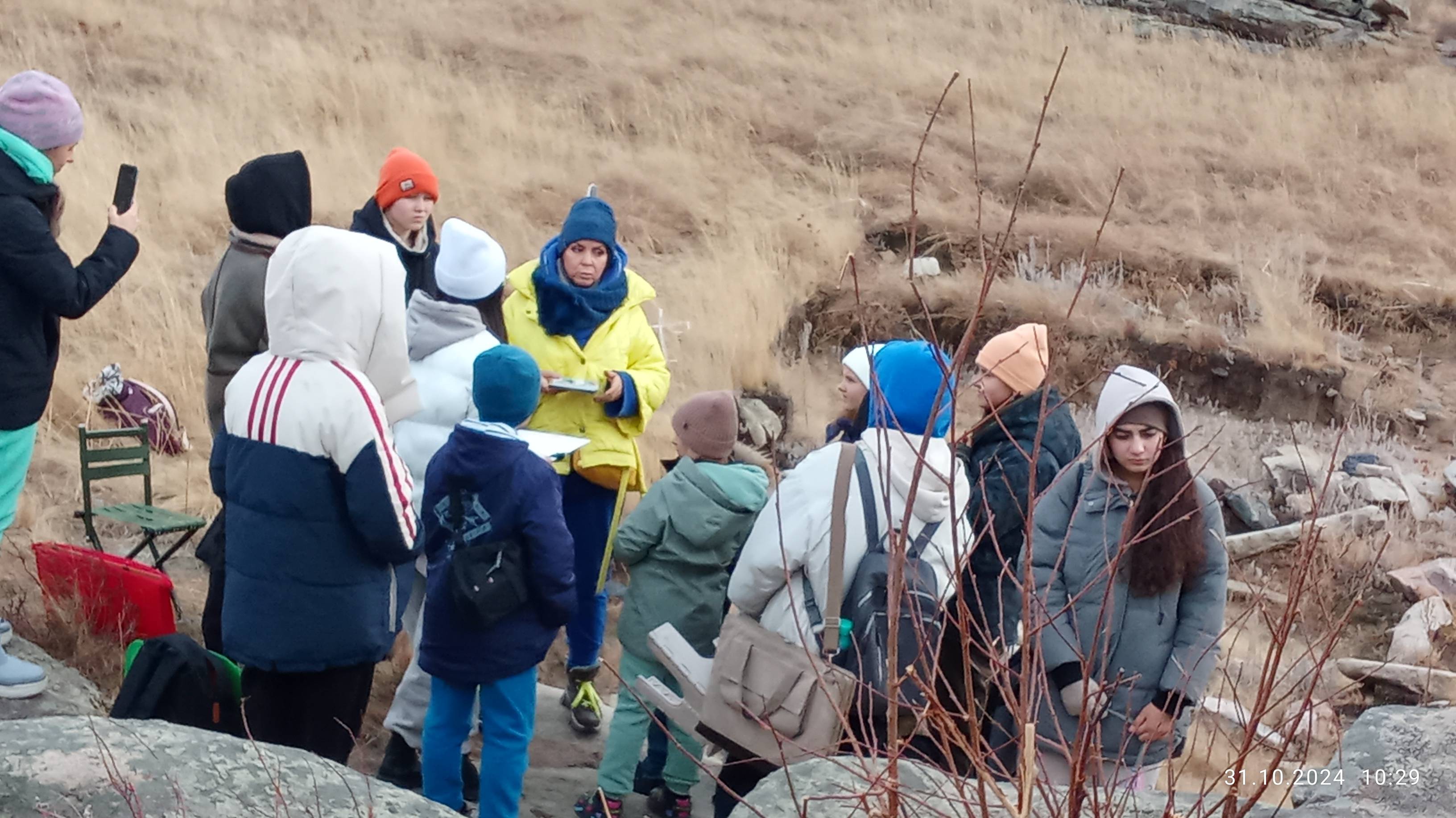 Ученики студии педагога по изобразительному искусству Юлии Чайко. "Художественное отделение", детской школы искусств "Жулдыз" и школы дизайна "ABCD". Экскурсия - пленэр, изучение петроглифов Акбаура через рисование с натуры. Наброски, масляная пастель, цветной картон.
