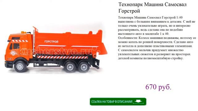 http://tut-ok.ru/mashiny/54651.php Технопарк Машина Самосвал Горстрой 1:40 выполнена с большим вниманием к деталям. С ней не только очень увлекательно играть, но и интересно рассматривать, ведь сделана она по подобию настоящего авто в масштабе 1 к 40. Особенности: Колеса машинки подвижны, поэтому ее можно катать по ровной поверхности. Сделано авто из металла и дополнено пластиковыми элементами. С самосвалом мальчик придумает множество увлекательных сюжетов и развернет на просторах детской комнаты полномасштабную стройку. #Детские #игрушки для #детей