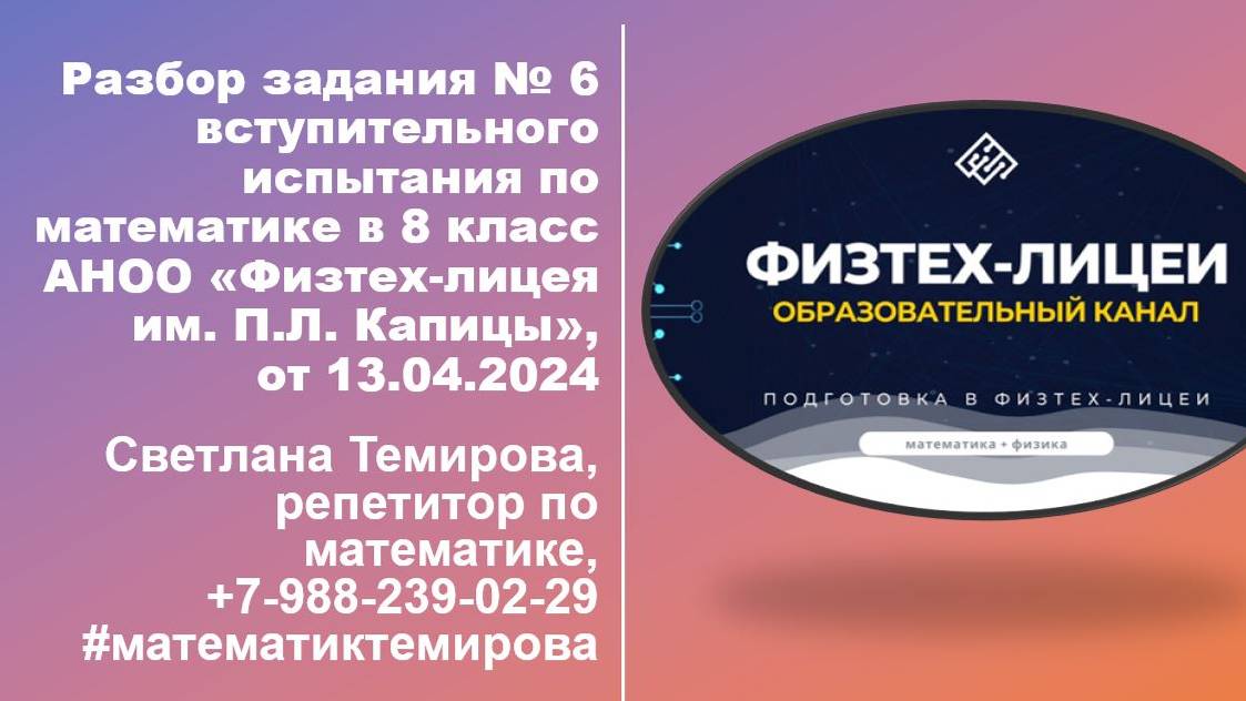 Как поступить в Физтех-лицей? Уметь решать сложные и нестандартные задания. Разбор вступительного варианта в "Физтех-лицей им. П.Л. Капицы", г. Долгопрудный. Решение будет полезным для учеников 7 класса и их родителей. Всем, кто готовится к поступлению в профильные школы, где на экзамене нужно продемонстрировать умение решать задания повышенной сложности. Светлана Темирова, +7-988-239-02-29 (Телеграм, ватсапп) #математиктемирова