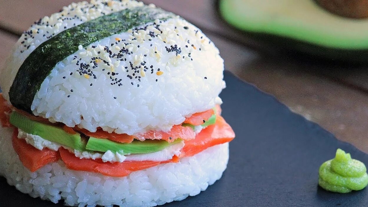 Суши бургер 🍙 Пошаговый рецепт Ингредиенты: • Рис • Рисовый уксус • Соль, сахар • Творожный сыр • Огурец • Красная рыба • Авокадо • Лист нори • Яйцо • Крахмал • Сухари панко • Унаги соус #закуски #бургер #закуски #перекус