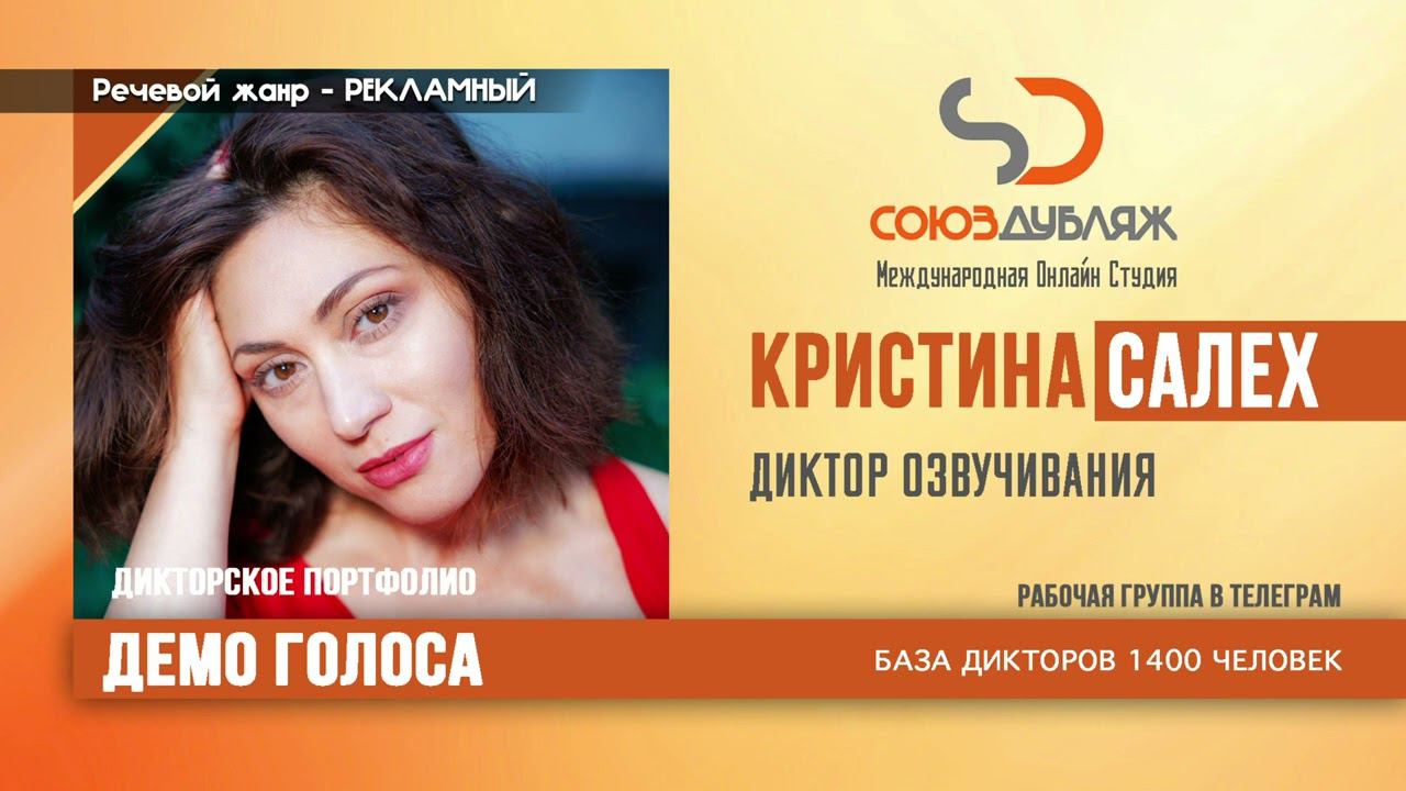 #СоюзДубляж #БазаДикторов #Озвучка ✔️Кристина Салех, ведущая - диктор озвучивания. Международная Онлайн-Студия "СОЮЗДУБЛЯЖ" - профессиональная озвучка и дубляж. ▪️Рабочая группа в Телеграм: https://t.me/soyuzdubliazh ▪️Контакт для связи: https://t.me/SoyuzAdmin ▪️Подпишись:https://www.youtube.com/c/SOYUZDUBLIAZH ▪️Сайт: https://www.soyuzdubliazh.com/ Лучшие голоса для вашей аудиорекламы и видеороликов. База дикторов - 5 000 человек, профессионального уровня на ENG| FR| TR| RU| ISR| AZ| UA| KZ| UZ| языках. Мужские и Женские топовые голоса для озвучки любых проектов, таких как: Рекламы, Презентации, Фильмы, Сериалы, Игры, Мультфильмы, ТВ Шоу, Аудио-видео визитки. ✔️Сотрудничая с нами вы получаете свой проект под ключ, не выходя из дома или офиса. Наша слаженная команда из лучших дикторов, актёров озвучивания, режиссёров и звукорежиссёров в кратчайшие сроки озвучат или отдублируют ваш заказ на профессиональном уровне. Образцы работ нашего портфолио вы сможете посмотреть на канале СОЮЗДУБЛЯЖ. ВНИМАНИЕ: ✔️Мы приглашаем специалистов озвучки к сотрудничеству в нашей команде. Вы можете пройти по ссылке в наш телеграм канал и связаться с Админом для обсуждения. ✔️Всем заказчикам подобных медиа проектов по озвучки и дубляжу фильмов, сериалов, документалок обращаться непосредственно к Админу Телеграм группы СОЮЗДУБЛЯЖ, пройдя по ссылке: Проходи по ссылке: https://t.me/soyuzdubliazh International Online-Studio SOYUZDUDLIAZH presents a highly professional approach in voice-over and dubbing. ▪️Our working group https://t.me/soyuzdubliazh ▪️Chief manager https://t.me/SoyuzAdmin ▪️Follow https://www.youtube.com/c/SOYUZDUDLIAZH ▪️Web: https://www.soyuzdubliazh.com/ We offer You the best Voices for your Audio commercials and Video`s. Our Database contains over 5 000 voices of native speakers and high-class foreign language specialists in ENG| FR| TR| RU| ISR| AZ| UA| KZ| UZ|. Male & Female top level voices for all the variety of dubbing projects such as commercials, presentations, movies, TV-series, video and computer games, cartoons, TV-shows, audio & video portfolio’s – all in one place. As your business partner we guarantee a turn-key project without you leaving your house or office. Our target is to make sure that the dubbing of your project is made as quick as possible by a well-coordinated and professional team of the best speakers, film and sound directors. To whom it may concern! We invite dubbing specialists to join our team. Please contact our manager on Telegram https://t.me/soyuzdubliazh