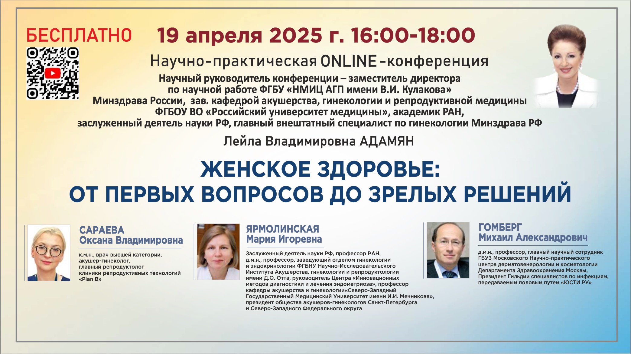Научно-практическая онлайн конференция: ЖЕНСКОЕ ЗДОРОВЬЕ: ОТ ПЕРВЫХ ВОПРОСОВ ДО ЗРЕЛЫХ РЕШЕНИЙ От первой менструации до периода менопаузы, гинеколог сопровождает женщину на всех этапах ее жизни, помогая сохранить здоровье, реализовать мечты о материнстве и поддерживать высокое качество жизни в зрелом возрасте. Ведущие эксперты поделятся своим опытом о нарушениях менструального цикла, раскроют современные подходы к диагностике и лечению этой распространённой проблемы, представят практические инструменты для разработки индивидуальной «дорожной карты» и МГТ для каждой пациентки, учитывая стадию репродуктивного старения, выраженность симптомов и сопутствующие заболевания. Также мы обсудим как решать проблемы лечения женщин с вульвовагинальными инфекциями и что это решение состоит не только в избавлении от инфекционных агентов вызывающих эти состояния, но и в восстановлении нормальной лактофлоры во влагалище. Чтобы быть в курсе последних достижений и передовых методик, приглашаем Вас на нашу конференцию, где вы сможете значительно расширить свои знания в этой области и применять их на практике. Научный руководитель конференции: АДАМЯН Лейла Владимировна Заместитель директора ФГБУ «НМИЦ акушерства, гинекологии и перинатологии имени В.И. Кулакова» Минздрава России, зав. кафедрой репродуктивной медицины и хирургии ФГБОУ ВО «Российский университет медицины», академик РАН, заслуженный деятель науки РФ, главный внештатный специалист по гинекологии Минздрава РФ Спикеры: САРАЕВА Оксана Владимировна - к.м.н., врач высшей категории, акушер-гинеколог, главный репродуктолог клиники репродуктивных технологий «Plan B» ЯРМОЛИНСКАЯ Мария Игоревна — Заслуженный деятель науки РФ, профессор РАН, д.м.н., профессор, заведующий отделом гинекологии и эндокринологии ФГБНУ Научно-Исследовательского Института Акушерства, гинекологии и репродуктологии имени Д.О. Отта, руководитель Центра «Инновационных методов диагностики и лечения эндометриоза», профессор кафедры акушерства и гинекологии«Северо-Западный Государственный Медицинский Университет имени И.И. Мечникова», президент общества акушеров-гинекологов Санкт-Петербурга и Северо-Западного Федерального округа ГОМБЕРГ Михаил Александрович — д.м.н., профессор, главный научный сотрудник ГБУЗ Московского Научно-практического центра дерматовенерологии и косметологии Департамента Здравоохранения Москвы, Президент Гильдии специалистов по инфекциям, передаваемым половым путем «ЮСТИ РУ» ПРОГРАММА КОНФЕРЕНЦИИ: 1) "МЕНСТРУАЛЬНЫЙ ЦИКЛ И ЕГО НАРУШЕНИЯ: СОВРЕМЕННЫЕ СТРАТЕГИИ ЛЕЧЕНИЯ" ( САРАЕВА Оксана Владимировна ) 2) "КАК СОХРАНИТЬ ЗДОРОВЬЕ И БЛАГОПОЛУЧИЕ ЖЕНЩИНЫ НА РАЗНЫХ ЭТАПАХ КЛИМАКТЕРИЯ. ДОРОЖНАЯ КАРТА" ( ЯРМОЛИНСКАЯ Мария Игоревна ) 3) "ДВОЙНОЙ БАЛАНС: РОЛЬ ВАГИНАЛЬНОГО И КИШЕЧНОГО МИКРОБИОМА В ПОДДЕРЖАНИИ ЗДОРОВЬЯ ЖЕНЩИН" ( ГОМБЕРГ Михаил Александрович ) «Дискуссия. Ответы на вопросы» Адамян Л.В., Сараева О.В., Ярмолинская М.И., Гомберг М.А.