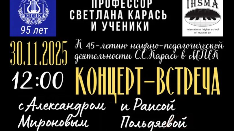 30.11.2025г. Профессор кафедры Фортепиано и струнных оркестровых инструментов МГИК Светлана Карась и ученики Концерт, посвящённый 95-летию Московского государственного института культуры и 45-летию научно-педагогической деятельности С.С.Карась г.Москва, Концертный зал Нотно-музыкальной библиотеки им. П.И.Юргенсона 01:23 Ф. Шопен Ноктюрн си бемоль минор Ор. 9 № 1 Исполняет Александр Миронов 08:45 Л.В.Бетховен Adagio Cantabile из Сонаты до минор № 8, Ор. 13 Исполняет Александр Миронов 13:58 С. В. Рахманинов. «Русская песня» из цикла 6 фортепианных пьес для фортепиано в 4 руки, Оp. 11. Исполняет Светлана Кутина и Александр Миронов 18:28 П.Чайковский Ночи безумные Ор. 60 №6 Исполняют Зульфия Хабибуллаева (вокал) и Александр Миронов (фортепиано) Ансамбль народных инструментов «Лира» имени Владимира Польдяева Руководитель и концертмейстер Раиса Польдяева 22:21 Владимир Польдяев Марш Исполняет Екатерина Гончарук (балалайка) 23:35 В. Котельников Танец Исполняет Анна Болдырева и Николай Колесников (балалайка) 24:36 П.Цильхер У гномов (переложение Владимира Польдяева) Исполняет Пётр Левчин (балалайка) 25:52 В.Андреев Вальс - Грёзы (переложение Владимира Польдяева) Исполняет София Павлюк (балалайка) 28:32 Немецкая народная песня «Ах, мой милый Августин» (обработка Владимира Польдяева) Исполняет Елизавета Абажаева (балалайка) 30:28 Русская народная песня «На улице две курицы» (обработка Владимира Польдяева) Исполняет Елизавета Абажаева и Екатерина Гончарук 32:18 Владимир Польдяев Юмореска Исполняет Петр Гавриленков 34:47 Владимир Польдяев Полька-диалог Исполняет Екатерина Гончарук (балалайка) 36:54 И.Шварц Концертино (переложение Владимира Польдяева) Исполняет Максим Антонов (балалайка) 39:32 Английская народная песня «Двадцать крошечных пальчиков» (обработка Владимира Польдяева) Исполняют Анна Гончарук и Екатерина Гончарук 41:49 Кубинский танец (обработка Владимира Польдяева) Исполняет Семен Бушуев (балалайка) 43:04 «Шестёра» уральская кадриль (обработка Владимира Польдяева) Исполняет Максим Антонов (балалайка) Исполняет ансамбль народных инструментов «Лира» имени Владимира Польдяева в составе: Елизавета Абажаева, Екатерина Гончарук, Семен Бушуев, Дарья Борисова, София Павлюк, Максим Антонов, Анна Гончарук. Мария Табунова 45:54 «А я по лугу» (обработка Глейхмана) 47:44 «Ристу-кондра» карельская народная тема (обработка Владимира Польдяева) 50:17 Русская народная песня «Коробейники» (обработка Владимира Польдяева) 53:42 П. Мариа Токката (переложение Раисы Польдяевой) 56:35 Владимир Польдяев «Попурри на темы джазовых мелодий»