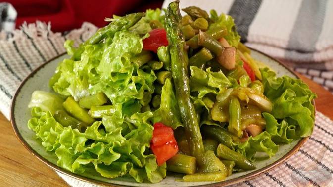 Вкусный и полезный микс овощей и грибов. Спаржа и стручковая фасоль прекрасно сочетаются с огурцами, помидорами и обжаренными грибами. Листья салата и петрушка добавляют свежесть и аромат. Для заправки используется лимонный сок, овощной отвар и растительное масло. #ОвощнойСалат #СпаржаРецепты #СалатсФасолью #СалатизСпаржисОгурцами #СалатсОвощамиииГрибами