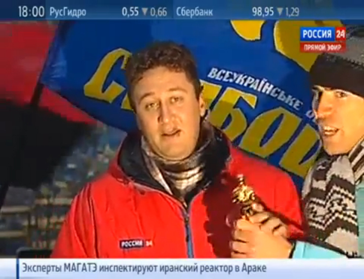 Украинский журналист незапланированно поучаствовал в прямом включении телеканала «Россия 24» с Майдана Незалежности в Киеве, где вечером в воскресенье, 8 декабря, продолжается массовая акция протеста. Об инциденте пишет интернет-издание «Украинская правда».<br/> Виталий Седюк обратился к российскому корреспонденту Артему Колу, чтобы вручить ему маленькую статуэтку «Оскара» для «России 24» и сотрудника ВГТРК Дмитрия Киселева. По словам Седюка, они удостоились награды «за ахинею и ложь в прямом эфире». «Мы любим россиян, но после того, как вы освещаете...» — сказал Седюк, но закончить мысль не успел, так как Кол вытолкнул его из кадра.<br/> Российский корреспондент затем отметил, что ему «довольно тяжело работать в прямом эфире», принял статуэтку от Седюка и поблагодарил его. После этого Кол сообщил зрителям, что «майдановцы» устроили «своеобразную цензуру» и требуют, чтобы о них передавали только положительную информацию.<br/> Это уже не первая подобная акция Седюка. 3 декабря он прервал прямое включение санкт-петербургского Пятого канала с Майдана Незалежности, чтобы выяснить, почему российские журналисты «лгут в прямом эфире». Ранее Седюк, работающий на развлекательном украинском канале 1+1, безуспешно попытался поцеловать актера Уилла Смита и выбежал на сцену во время вручения премии «Грэмми» певице Адель.<br/> Напомним, вечером в воскресенье число участников киевской акции за евроинтеграцию Украины достигло, по некоторым оценкам, 300 тысяч человек. Оппозиционеры пикетируют административные здания, требуя отставки правительства, а сторонники националистической партии «Свобода» снесли и разрушили памятник Владимиру Ленину на Бессарабской площади. Митинги и демонстрации, получившие название «евромайдан», проходят в Киеве с 23 ноября.<br/> Источник: http://lenta.ru/