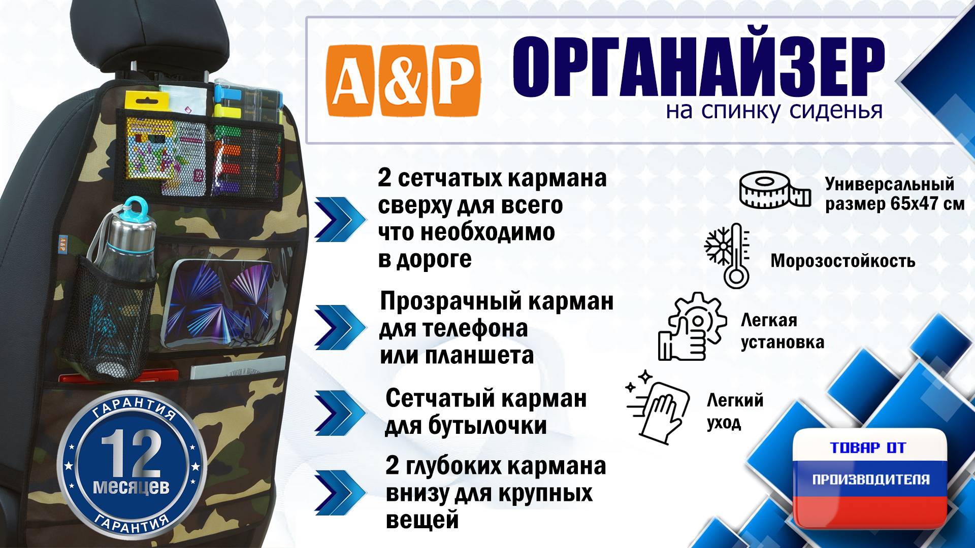 Заказать органайзер на спинку сиденья автомобиля из ткани Оксфорд, а также другие аксессуары можно на официальном сайте компании А&Р Групп: https://ap-group-llc.ru/ Возможность изготовления товаров по индивидуальным размерам и проектам. Гарантия на продукцию 1 год. Доставка осуществляется по всей России, а также в Казахстан и Беларусь. _______________________________________________________________________ Мы ВКонтакте: https://vk.com/apgroup Мы на Wildberries: https://www.wildberries.ru/seller/198927 Мы на Ozon: https://www.ozon.ru/brand/a-p-87358243/ Мы на Я.Маркете: https://market.yandex.ru/business--a-r-grupp-rossiiskii-proizvoditel-aksessuarov/864809