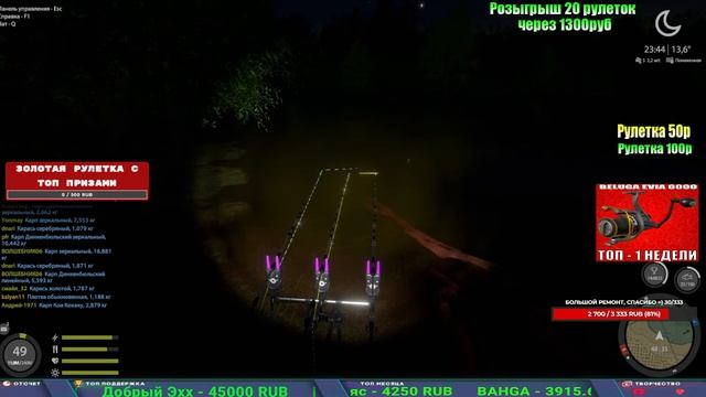 Поддержка донатом https://new.donatepay.ru/@1032463 Альтернативный донат https://www.donationalerts.com/r/kalyamba11 5536913964533059 карта Тинькоф Если стрим лагает,смотри стрим на трово https://trovo.live/s/Kalyamba_na_Ribalke Мой ВК - https://vk.com/kalyantv НИК в игре kalyan11 НАШ ДИСКОРД СЕРВЕР https://discord.gg/3ZeEDGs5h6 Заказ водоема на 1 час - 500р ( весь стрим 2500р ) Модерка на канале 1300р ( каждая следующая на 100р больше) ✅Призы в рулетке "ЗОЛОТАЯ" 500р ✔ ЗОЛОТО ✔ ПРЕМ ✔ КАТУШКИ РАПТОР 40, ВЕНГИ, ТАЙГА, СИЛЬВЕР 80, И другие ✔ ПАЛКИ ПИЛКЕРНАЯ, ДОНКА МОРСКИЕ, ✔ РОД ПОД, СТУЛЬЯ ✅Призы в рулетке СТАНДАРТ : 100р ✔ катушкИ РАПТОР 40, ВЕНГИ, ТАЙГА, СИЛЬВЕР 80, И другие ✔ катушки 60 для медного ( ЭВИИ, НАТОРЫ, ГОЛДА, и тд) ✔ ПИЛКЕРНОЕ УДИЛИЩЕ КОРОЛЕВА ОКЕАНА ✔ Морское Донное удилище ✔ прем ( 3, 7, 30 дней) ✔ золото ( 1, 3, 5, 10, 20 ,50) ✔ билет на море ( 1, 3, 5 дней) ✔ голд наживка и др. ✅Призы в рулетке "СТАРТОВАЯ" 50р ✔ катушка Венга ✔ катушка "silver80" ✔ катушка "БЕЛЫЙ КАЛИБР" ✔ катушка "Черный калибр" ✔ катушка "Протон" ✔ катушка "Нарга 6000" ✔ Набор Фидерист и спинингист ✔ Карповик Фортуна ✔ фидерные удилища ✔ прем, золото, алкашка, наживки и тд P.s Рулетка это не казино, а награда за поддержку стримера. Вечный ТОП ПОДДЕРЖКИ (10.06.2025) 1. Леха сварной 214 572 2. Dimon_pokemonchik 127 034 3. Skreb79 103 061 4. Interceptor 96 230 5. FishRus86 82 500