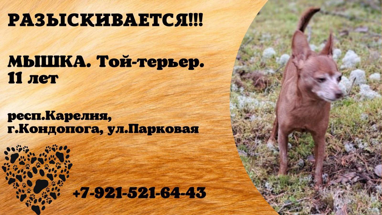 Карелия Кондопога Пропала собака Кличка МЫШКА ( по паспорту Малышка на Миллион) Порода той-терьер, возраст 11 лет. Пропала в г. Кондопога, в районе ул. Парковой. Телефон 8921-521-63-43 Инфо https://vk.com/wall-198815410_158809 Автор https://vk.com/id16884605