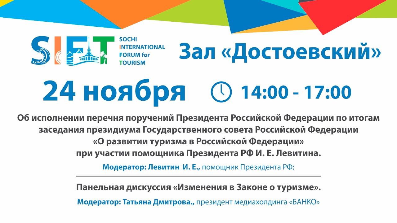 Об исполнении перечня поручений Президента Российской Федерации по итогам заседания президиума Государственного совета Российской Федерации «О развитии туризма в Российской Федерации» при участии помощника Президента РФ И.Е. Левитина Модератор: И.Е. Левитин, помощник Президента РФ. Спикеры: Сафонов О.П., Руководитель Федерального агентства по туризму; представители Минэкономразвития РФ, Министерства культуры РФ, Министерства промышленности и торговли РФ, Министерства курортов и туризма Республики Крым. Панельная дискуссия «Изменения в Законе о туризме» Модератор: Татьяна Дмитрова, президент медиахолдинга «БАНКО». Спикеры: Барзыкин Ю.А., вице-президент Российского союза туриндустрии; Мохов Г.А., основатель компании ООО «Юридическое агентство Персона Грата»; Осауленко А.П., директор ассоциации «Турпомощь»; Тополкарёв В.А., генеральный директор «НТК Интурист». Место проведения: зал «Достоевский» Международный туристский форум в Сочи SIFT-2016 http://tour-forum.com/