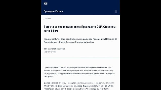 Смотрите плейлисты: Президент РФ Владимир Путин https://rutube.ru/plst/1282588 Новости политики https://rutube.ru/plst/921867 Владимир Путин принял в Кремле специального посланника Президента Соединённых Штатов Америки Стивена Уиткоффа. 22 января 2026 года 23:25 Москва, Кремль С российской стороны во встрече участвовали помощник Президента Юрий Ушаков и спецпредставитель Президента по инвестиционно-экономическому сотрудничеству с зарубежными странами, генеральный директор РФПИ Кирилл Дмитриев. С американской стороны – предприниматель, инвестор, основатель компании Affinity Partners Джаред Кушнер и комиссар Федеральной службы по закупкам Управления общих служб Соединённых Штатов Америки Джош Грюнбаум.