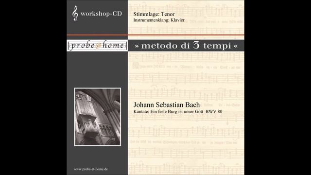 https://probe-at-home.eu/ Übungs-Datei für: Ein feste Burg ist unser Gott, bis/till/jusqu'à - Takt/bar/mesure/tempo/compás 119 Nr. 1 from the cantata / aus der Kantate: Ein feste Burg ist unser Gott BWV 80 by/von J.S. Bach Karaoke light means: You only will hear the first 6 bars of the vocal part Tenore Karaoke light bedeutet: Ihr hört nur die 6 ersten Takte des Tenor T3 = Tempo 3 = tempo in performance / Aufführungstempo vocal register / Stimme: minus Tenore / ohne Tenor Sound/Klang: Piano / Klavier Da der Tenor (nur der Tenor) sofort mit dem Orchester einsetzt, habe ich den Einsetzton und 2 Takte Metronom vorangestellt, damit auch das Tempo sofort aufgenommen werden kann. Ihr findet hier bei YouTube ebenfalls Versionen, in denen jede einzelne Simme hervorgehoben ist. Wahlweise ist die hervorgehobene Stimme als Klavier oder als Streichinstrument hörbar. Desweiteren gibt es eine zusätzliche Karaoke-Version (Karaoke professional) und eine Version ohne Hervorhebung einer Stimme. Das gesamte Werk mit allen Chorsätzen, ist eine Einzel-CD, und kann für jede Stimme erworben werden, bei: https://www.probe-at-home.eu/