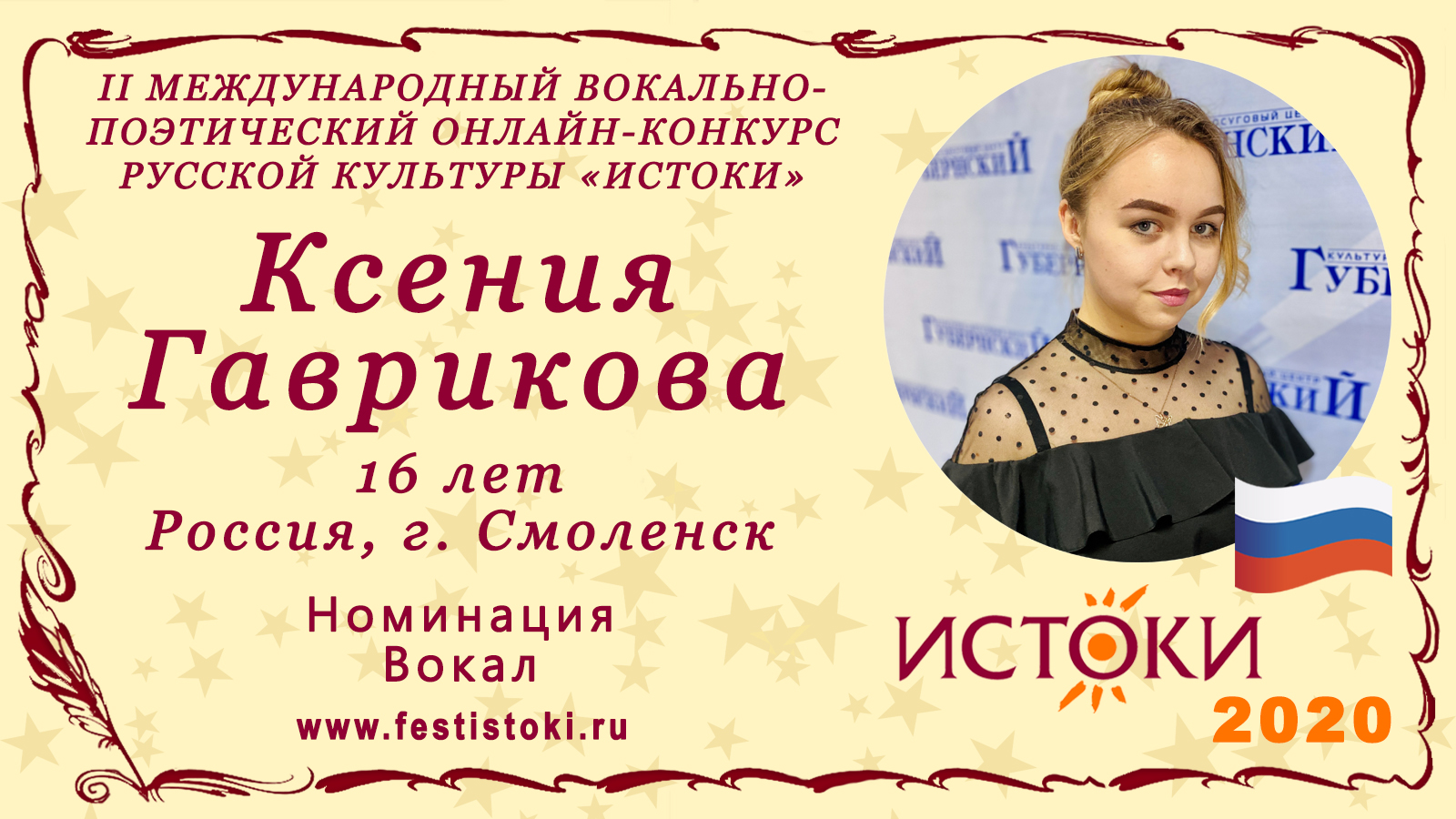 Участник II Международного вокально-поэтического онлайн-конкурса русской культуры «Истоки». Номинация - Вокал. Песня "Вперёд, Россия!". Автор слов и музыки Олег Газманов. Сайт: www.festistoki.ru / www.festistoki.com E-mail: festistoki@mail.ru