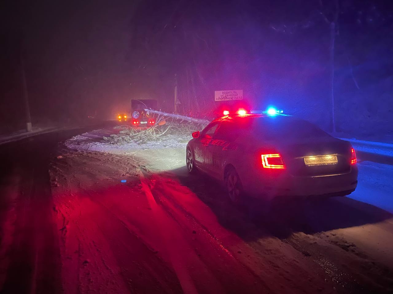 ?Сотрудники Госавтоинспекции обеспечивают безопасность дорожного движения в месте падения дерева на проезжую часть в районе Ангарского перевала. ?Сотрудники полиции обращаются к водителям: будьте внимательны на дороге, заблаговременно снижайте скорость движения.