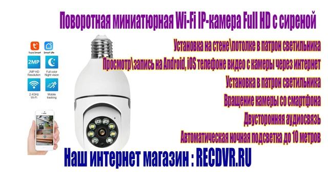 https://recdvr.ru - 4G WiFi IP Мини и микро камеры. У нас можно купить скрытые камеры для видеонаблюдения с сим картой и с записью. Доставка по Москве, Подмосковью и всей России. Установка на стене\потолке в патрон светильника Просмотр\запись на Android, iOS телефоне видео с камеры через интернет Вращение камеры со смартфона Двусторонняя аудиосвязь Автоматическая ночная подсветка до 10 метров Устанавливается камера RECDVR M007 на потолке или на стене в стандартный патрон светильника Е27 и не привлекает внимания во время работы. Камера поддерживает дистанционный доступ со смартфонов (iOS, Android) через бесплатное приложение, а также с ПК через веб-сервис производителя. Поддерживается просмотр видео с камеры в режиме реального времени, а также удаленный доступ к архиву видеозаписей. Записи сохраняются на карту памяти объемом до 128 Гб или в «облако» от производителя (платная услуга). Устройство оснащено поворотным механизмом, что обеспечит пользователю круговой обзор помещения, а также микрофоном, динамиком и автоматической ночной подсветкой. Камера может выполнять охранные функции и оснащена встроенной звуковой сиреной, которая включается при появлении движущегося объекта. Кроме того, при обнаружении движения или громкого звука камера отправит пользователю тревожные уведомления на смартфон. Для работы с камерой необходимо наличие Wi-Fi сети с доступом в Интернет в месте ее установки. Питание осуществляется от 220 В напрямую.