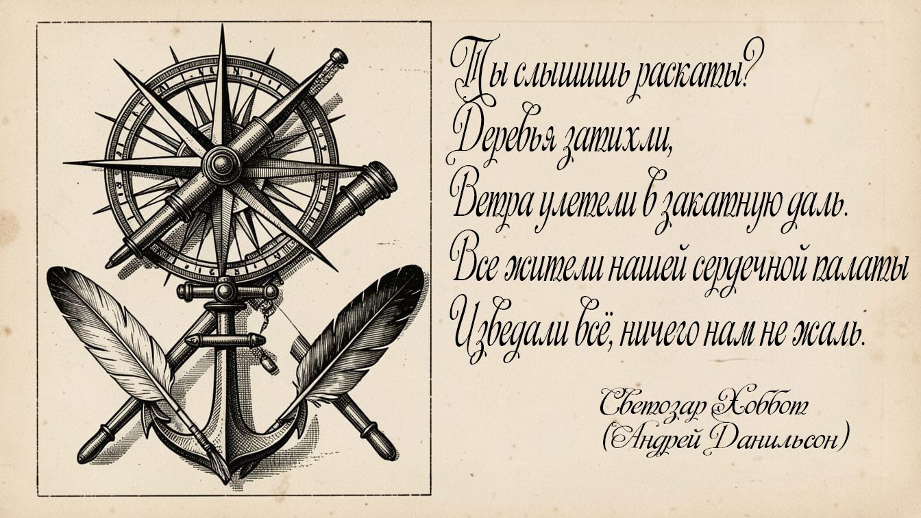 Ты слышишь раскаты? Деревья затихли, Ветра улетели в закатную даль. Все жители нашей сердечной палаты Изведали все, ничего нам не жаль. Жалеть смысла нет, что ушло не вернется, Мы сдали зачеты, ответы нашли. Но слышишь грозу? Тучи слопали солнце, Златые бараны считают нули. Начало начал, занавеска рассудка, Еще не упала в пыль капля дождя. Ты понял, приятель, что это не шутка? Грохочет реальность грядущего дня. © Copyright: Андрей Данильсон, 2017 Свидетельство о публикации №117092808006 Все права на песню принадлежат мне. #оркестрсветозарахоббота #сунотрек #русскаярокмузыка #авторскаялирика #неформат #поддержинезависимых #роликипроразмышления #новаямузыка