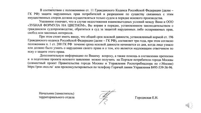 В ответе Управления Роспотребнадзора по ЦАО г. Москвы (далее – Управление) от 03.08.2023 надлежащий ответчик по претензии Заявителя о выдаче заверенной копии медицинской карты стоматологического пациента ООО «Стоматологическая клиника Елены Мокренко» подменялся на ненадлежащего ответчика ООО «Зубная Формула на Цветном» несмотря на основания, предварительно известные Управлению из обращения Заявителя от 13.07.2023, подтверждавшим наличие медицинской карты стоматологического пациента Заявителя в ООО «Стоматологическая клиника Елены Мокренко»: • 27.02.2023 во время приглашения на профилактический осмотр сотрудница ООО «Стоматологическая клиника Елены Мокренко» сообщила Заявителю об установке ему имплантов Osstem, а не имплантов Nobel, которую оплачивал Заявитель; сведения об установке Заявителю имплантов Osstem можно было получить только из медицинской карты стоматологического пациента Заявителя, следовательно, медицинская карта стоматологического пациента Заявителя находилась в ООО «Стоматологическая клиника Елены Мокренко». • Ответ ООО «Стоматологическая клиника Елены Мокренко» от 14.04.2023 https://disk.yandex.ru/i/hD0nm-FzTPNG2w на запрос Заявителя от 11.04.2023 https://disk.yandex.ru/i/Yqoiu6p8quQxEw о предоставлении финансовой информации по имплантации зубов в 2015-2016 годах, доступной только из медицинской карты стоматологического пациента Заявителя. • Ответ генерального директора ООО «Зубная Формула на Цветном» Рошковского Е.В. от 03.06.2023 https://disk.yandex.ru/i/x3UxvBbTFY9l0g , подтвердившего, что при продаже ООО «Стоматологическая практика Елены Мокренко» медицинская карта стоматологического пациента Заявителя не передавалась. Обоснованием определения надлежащим ответчиком ООО «Зубная Формула на Цветном» по претензии Заявителя о непредоставлении ему Мокренко Е.Н. заверенной копии медицинской карты стоматологического пациента, полностью совпавшим с позицией Мокренко Е.Н. в ответе от 29.05.2023 https://disk.yandex.ru/i/GHV_CZVgF6mOPg , выступило совпадение адресов ООО «Стоматологическая практика Елены Мокренко» и ООО «Зубная Формула на Цветном» согласно выписке из ЕГРЮЛ, что было подтверждено в ответе генерального директора ООО «Зубная Формула на Цветном» Рошковского Е.В. от 03.06.2023 https://disk.yandex.ru/i/x3UxvBbTFY9l0g , сообщившего, что при продаже ООО «Стоматологическая практика Елены Мокренко» медицинская карта стоматологического пациента Заявителя не передавалась. Таким образом, Управление вопреки приведенным выше доводам, заняв позицию Мокренко Е.Н. в ответе от 29.05.2023 https://disk.yandex.ru/i/GHV_CZVgF6mOPg, оспариваемую Заявителем, • вынесло Предостережение в адрес ООО «Зубная Формула на Цветном», явно пытаясь подставить Заявителю ненадлежащего ответчика ООО «Зубная Формула на Цветном» вместо ООО «Стоматологическая клиника Елены Мокренко», указывавшее номер карты пациента Заявителя 68, совпадавшее с номером договора Заявителя 68 от 11.01.2015 с ООО «Стоматологическая практика Елены Мокренко» в документах: Предварительный план лечения от 26.10.2019 https://disk.yandex.ru/i/OXyJddANZrn6lw Предварительный план лечения от 02.10.2021 https://disk.yandex.ru/i/G9RE4kKgtegPpA • предложило разрешать конфликт с выдачей заверенной копии медицинской карты стоматологического пациента Заявителя с ООО «Зубная Формула на Цветном», к которому Заявитель не имеет никаких претензий, доказав наличие медицинской карты стоматологического пациента Заявителя в ООО «Стоматологичес