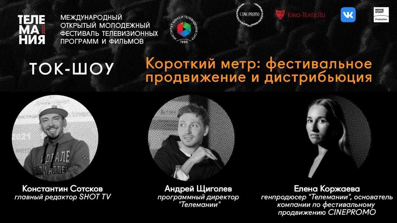 20 октября 2021, 16:00 Короткий метр: фестивальное продвижение и дистрибьюция Спикеры: - Константин Сотсков, главный редактор SHOT TV - Елена Коржаева, генпродюсер "Телемании", основатель компании по фестивальному продвижению CINEPROMO - Андрей Щиголев, программный директор "Телемании"