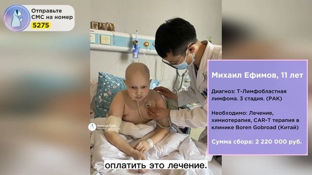 Врачи делают всё, чтобы сдерживать РАКовую опухоль! У мальчика осталась единственная и последняя возможность выжить! Миша очень страдает! Боли его не отпускают, он молча терпит и верит, что это закончится! Подарите надежду! Спасите Мишеньку! Михаил Ефимов, г. Санкт-Петербург Диагноз: Т-Лимфобластная лимфома. 3 стадия. (Рак) Необходимо: Лечение, химиотерапия, CAR-T терапия в клинике Boren Gobroad (Китай) Сумма сбора: 2 220 000 рублей Страница ребёнка на сайте фонда: https://kseniya.fund/komu-pomoch/mihail-efimov/?FAND=rutube Простая многодетная российская семья просит помощи! Их маленький вундеркинд Мишенька прямо сейчас погибает от РАКа! Вот так в одночасье может разрушиться жизнь любящей семьи. К такому невозможно подготовиться или принять. Нет ничего страшнее, чем услышать, что у твоего ребёнка онкология… Миша так мечтает победить РАК и поехать домой! В предновогодней суете мы думаем о празднике, о хорошем! Но давайте постараемся думать и о бедных детках, которые заперты в больнице... И жизнь которых висит на волоске и зависит от оплаченных счетов. Бедному Мишеньке нельзя даже вставать с кровати, а он тоже очень хочет праздника и Нового года! В 2025 году он просто хочет остаться в живых! Спасите Мишеньку! Выберите удобный способ пожертвования у нас на сайте: https://kseniya.fund/komu-pomoch/mihail-efimov/?FAND=rutube Отправьте СМС: - на номер 3434 со словами «Лечим Мишу» и любой суммой. Пример: Лечим Мишу 350 - на номер 5275 и с любой суммой пожертвования. Пример: 350 Банковские реквизиты: Получатель платежа: Благотворительный фонд «Ксения Спасает Жизни» ИНН 7814779325 КПП 781401001 ОГРН 1207800101497 ПАО «Сбербанк» Р/с 40701810755000000688 Банк: Северо-Западный банк ПАО Сбербанк БИК: 044030653 К/с 30101810500000000653 Назначение платежа: Благотворительное пожертвование для Михаила Ефимова. #мишаефимов #творидобро #ракуходи #лимфома #детироссии #семья #мойсынока #помоги #ксенияспасаетжизни