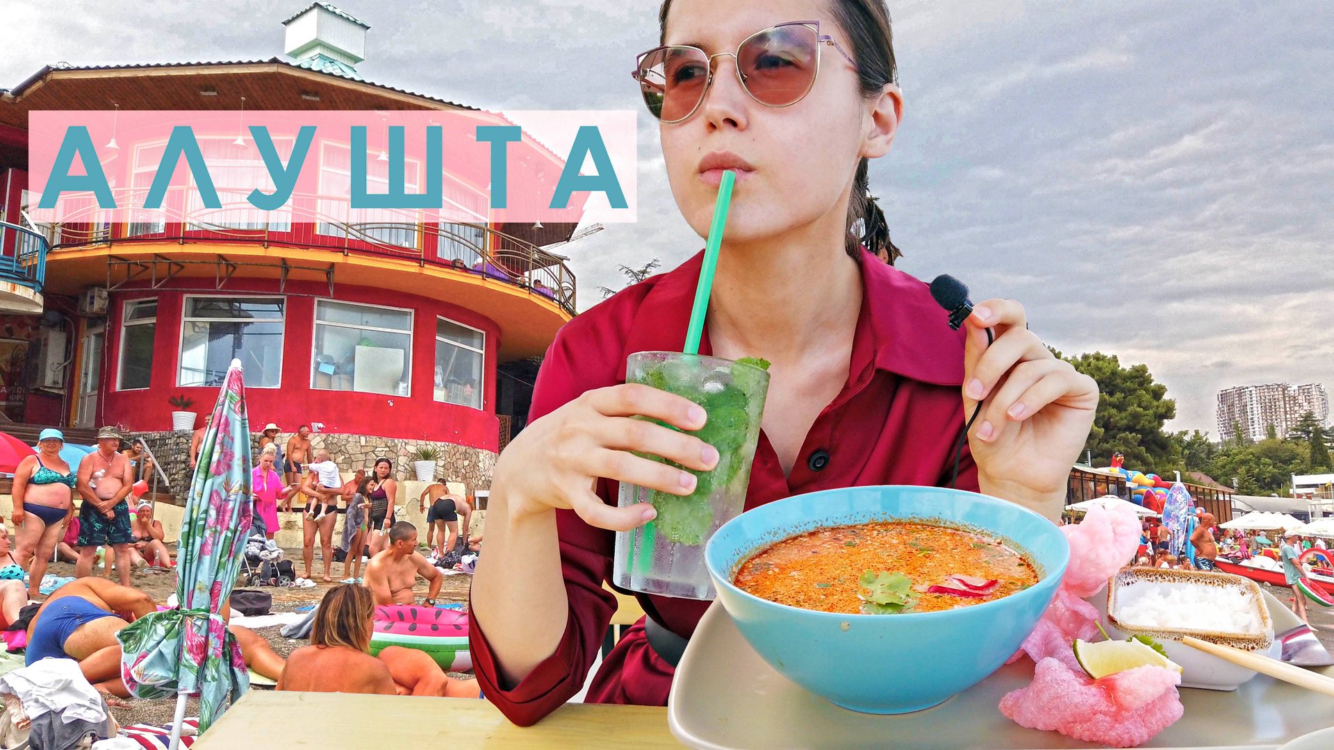 Алушта здесь толкучка. Что едят и пьют туристы. Получают загар на пляже. Новые постройки у моря. 4K