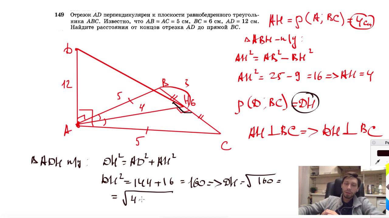 №149. Отрезок AD перпендикулярен к плоскости равнобедренного треугольника ABC. Известно, что АВ =АС = 5 см, ВС= 6 см, AD = 12 см. Найдите расстояния от концов отрезка AD до прямой ВС. Поддержать канал рублём - 5469400944002125 (Сбербанк) Мой второй канал для подготовки к ЕГЭ и ОГЭ - https://www.youtube.com/ЕвгенийСумин Инстаграм - https://www.instagram.com/EGE_OGE.math Личный инстаграм - https://www.instagram.com/ee_sumin VK - https://vk.com/evgeniysumin FB - https://www.facebook.com/EvgeniySumin