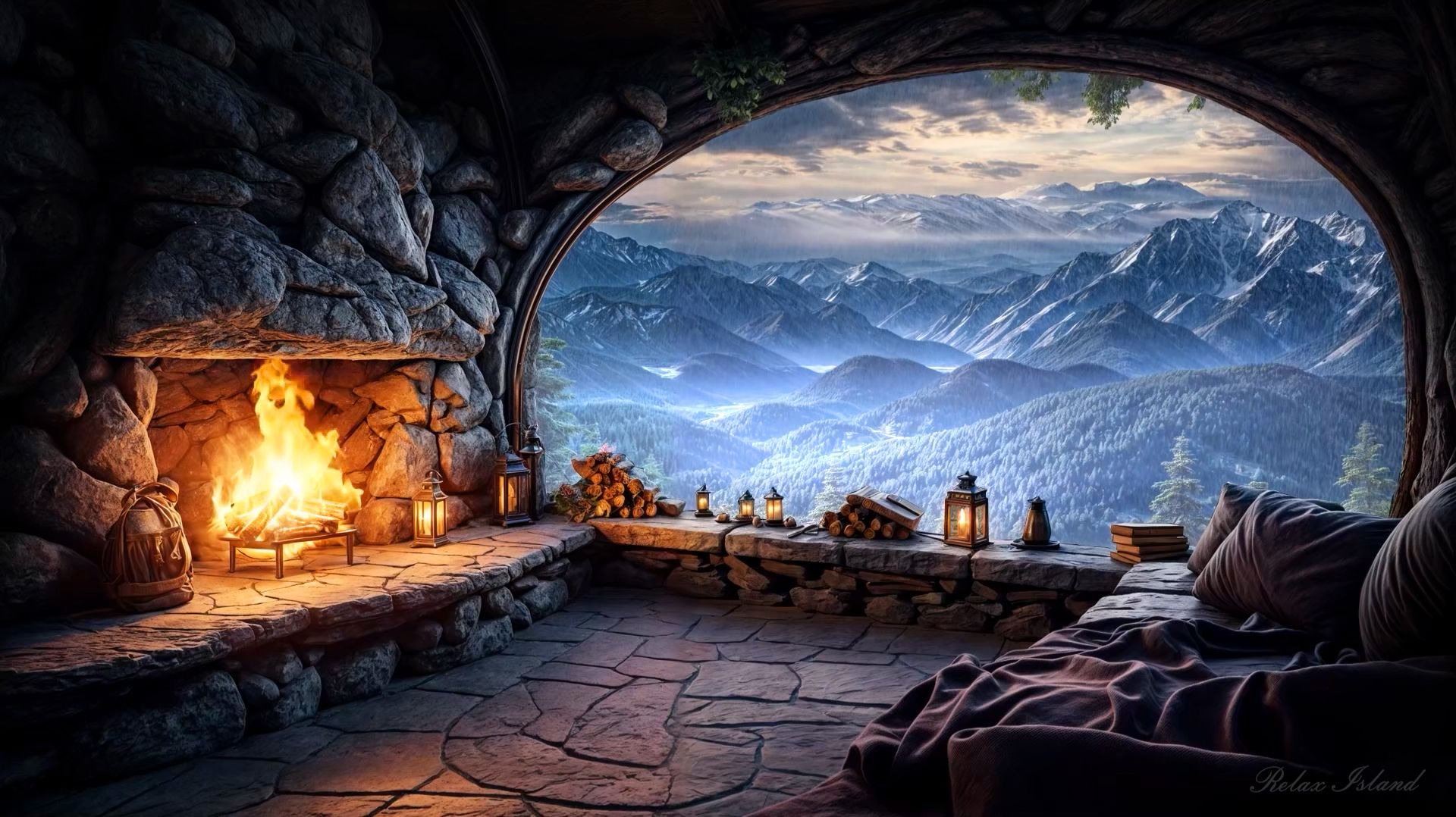 Просто очень красивая успокаивающая музыка для сна у камина в комнате с мягким диваном напротив и большим окном с видом на бескрайний лес и горы! Фортепианная нежная релакс музыка для души и шум дождя доносящийся с улицы! Очень пасмурная погода за окном, идёт проливной дождь, в комнате растоплен камин и медленная музыка для медитации создают идеальную атмосферу для релаксации! За окном всё затянуто плотными серыми тучами, и кажется, что день так и не решился стать светлым. Дождь льёт ровно и щедро, тяжёлыми струями стекает по стеклу, собирается в быстрые ручейки и снова распадается на капли. Иногда порыв ветра бросает воду под другим углом, и тогда по окну пробегают новые дорожки — живые, бесконечно меняющиеся. Далеко, за влажной пеленой, угадываются тёмные силуэты леса, а выше — спокойные линии гор, почти растворённые в тумане. В комнате тепло и уютно. Камин уже разгорелся: поленья потрескивают, угли дышат красным, а пламя мягко колышется, отбрасывая на стены и потолок тёплые золотистые блики. Напротив стоит мягкий диван — такой, в который хочется просто упасть и больше никуда не спешить. Воздух наполнен лёгким запахом дерева и тепла, будто сам дом заботливо держит вас в своих границах, пока непогода делает мир за окном шумным и мокрым. Фортепианная музыка звучит тихо и нежно, как спокойный разговор без слов. Она не торопится, не требует внимания — просто течёт рядом, поддерживая внутренний ритм. Ноты ложатся мягко, с длинными паузами, в которых слышно всё остальное: дождь, потрескивание огня, редкий вздох ветра у крыши. Шум ливня с улицы становится частью этой мелодии — ровным, успокаивающим фоном, который словно смывает остатки напряжения. Вы устраиваетесь на диване удобнее, укрываетесь пледом или просто кладёте голову на подушку. Тело постепенно оттаивает после суеты дня: плечи опускаются, челюсть расслабляется, дыхание становится глубже. Взгляд то задерживается на огне, то уходит в большое окно, где лес и горы кажутся бесконечными и очень далёкими — как другая, тихая реальность, существующая за завесой дождя. Иногда в камине с тихим щелчком оседает полено, и пламя на мгновение вспыхивает ярче, будто делает вдох. В этот момент на стекле видны новые капли — они ловят отражение огня и превращаются в маленькие тёплые искры, которые тут же исчезают. Дождь продолжает стучать по крыше, по земле, по листьям, и в этом ритме есть удивительная устойчивость: как будто сама природа повторяет одно и то же спокойное движение, пока всё внутри наконец не выравнивается. Музыка для медитации ведёт мягко, почти незаметно. Мысли становятся редкими и лёгкими, перестают цепляться друг за друга. В голове появляется простор — такой же, как за окном, где лес уходит вдаль, а горы стоят неподвижно, не реагируя на ливень. В этом состоянии не нужно ничего решать, ничего доказывать и никуда бежать. Есть только тепло комнаты, огонь в камине, дождь за стеклом и спокойная фортепианная мелодия, которая помогает отпустить усталость. Постепенно шум дождя кажется всё более далёким, словно он остаётся где-то снаружи, а внутри становится совсем тихо и безопасно. Пламя качается медленно, как колыбельный свет, и каждый его отблеск напоминает: сейчас можно отдыхать. Сон подходит незаметно — мягко, как тень на стене, как последняя нота, растворяющаяся в воздухе. И мир за о