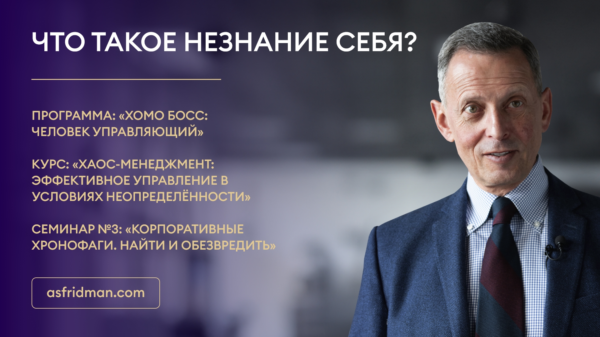 Что такое незнание себя? Программа: «Хомо Босс: Человек Управляющий» Курс: «Хаос-Менеджмент: Эффективное управление в условиях неопределённости» Семинар №3: «Корпоративные хронофаги. Найти и обезвредить» Расписание открытых семинаров Александра Фридмана: https://www.asfridman.com/raspisanie/