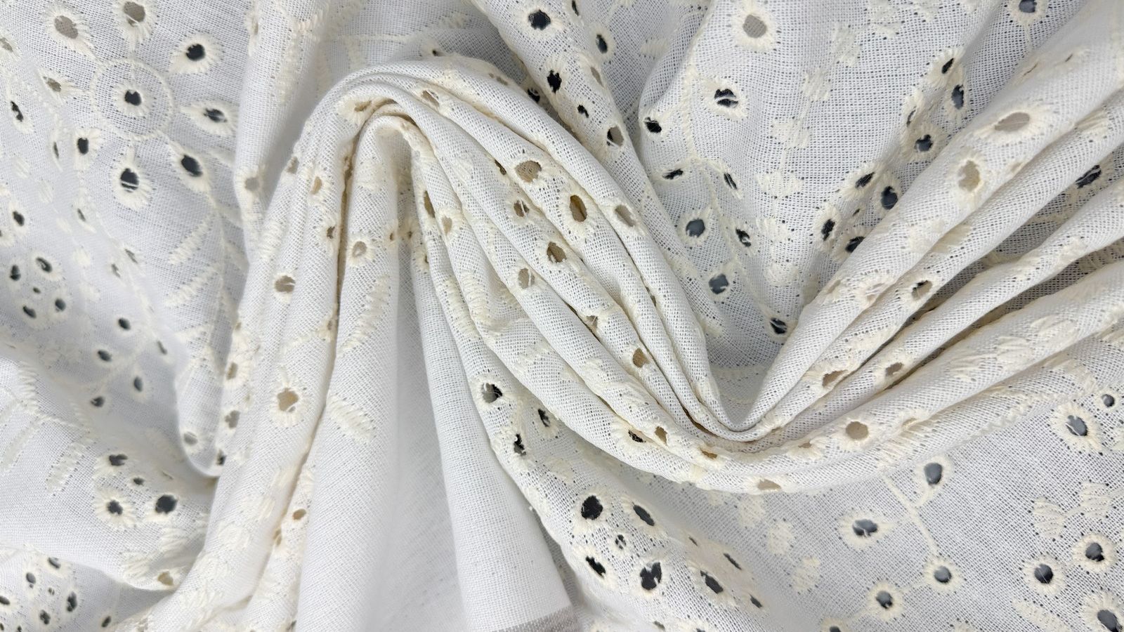 Ткань лен с вышивкой цвет белый с молочным. Смесовый материал на основе льна и вискозы выгодно отличается от чистого льна тем, что лучше держит форму, дольше носится, при этом очень приятен к телу, создает ощущение приятной прохлады. Рабочая ширина (полотно с вышивкой) 130 см. Достаточно плотная. Отверстия вырублены насквозь. Практически не тянется. Обладает малой сминаемостью. Возможна усадка до 10%. Основа слегка просвечивает. Что шить: рубашки, блузки, платья, сарафаны, шорты, широкие брюки. Уход за тканью: - бережная машинная или ручная стирка при температуре 30 градусов; - минимальные обороты на отжиме; - сушить в расправленном виде; - утюжка на минимальном температурном режиме; - не отбеливать.