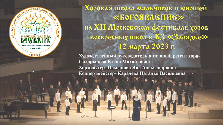 ХШМ и Ю "БОГОЯВЛЕНИЕ"- на XII Московском фестивале хоров воскресных школ-12.03.2023г. v.2 12 марта 2023 г. в Московском концертном зале «Зарядье» прошел XII Московский фестиваль хоров воскресных школ. Это мероприятие организовано Фондом содействия возрождению Синодального хора при поддержке Департамента национальной политики и межрегиональных связей города Москвы и Церковно-общественного совета при Патриархе Московском и Всея Руси по развитию русского церковного пения. В фестивале приняли участие лучшие детские хоровые коллективы столицы и г. Твери. В программе фестиваля прозвучали произведения церковной и светской музыки. Специальными гостями фестиваля стали Московский Синодальный хор (художественный руководитель и дирижер Заслуженный артист России Алексей Пузаков) и оркестр «Voce animа» (руководитель Алексей Медведев). Хоровая школа мальчиков и юношей «Богоявление» принимает участие в этом фестивале уже в пятый раз. Для учащихся школы выступление на одной из лучших концертных площадок г. Москвы является очень ответственным и важным. В исполнении хора мальчиков и юношей прозвучали три произведения: - "Единородный сыне, знаменный распев"- в обработке епископа Илариона Алфеева; - «От героев былых времен», муз. Рафаила Хозака, сл. Евгения Аграновича; - «Гимн Москве» из оперы Сергея Прокофьева «Война и мир». Выступление хоровой школы мальчиков и юношей «Богоявление» было тепло встречено зрителями концерта и удостоено продолжительными аплодисментами. В фильме использована видеозапись фестиваля Московским Синодальным хором.