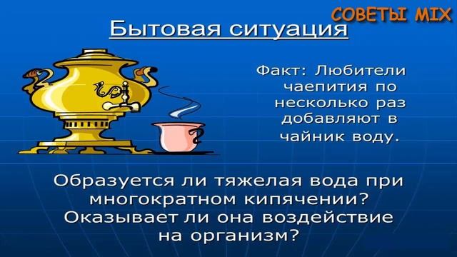 ПОЧЕМУ ПИТЬЕВУЮ ВОДУ НЕЛЬЗЯ КИПЯТИТЬ ДВАЖДЫ? Одним из основных способов обеззараживания и улучшения качества потребляемой воды было и остается ее кипячение, при котором убиваются множественные бактерии, снижается содержание хлора, вода становится мягче. Что ж, давайте разбираться, опасно повторное кипячение или нет? ===================================================== МИФ №1 Утверждение о том, что #кипятитьводу дважды нельзя, потому что в ней «становится меньше кислорода" не соответствует действительности. Кислорода в свежем кипятке столь же мало, как и в дважды кипяченном - и в несколько раз меньше, чем в воде, скажем, 90 градусов. Перенасыщенного раствора кислорода в воде в нормальных условиях не бывает, поэтому ни количество кипячений, ни скорость нагрева воды не важны. ===================================================== МИФ №2 Действительно, один из способов образования тяжелой воды – кипячение. Но чтобы вся вода в чайнике превратилась в тяжелую, его нужно кипятить несколько десятков лет! Сделать его в бытовом чайнике – даже не надейтесь. Любой химик со всей ответственностью скажет, что человек может без видимого вреда для здоровья выпить стакан тяжёлой воды, а буквально через несколько дней весь дейтерий будет выведен из организма. Так что не бойтесь "тяжелой воды" - пейте чай спокойно. Так что и второй, и третий раз воду можно безбоязненно кипятить. Только нужно ли это? Бактерии и вирусы уже убиты, а для получения кипятка, достаточно довести жидкость до состояния «побеления» – второй фазы процесса кипячения. И важно следить за емкостью, в которой вы кипятите воду – накипь нужно незамедлительно чистить (лимоном, уксусом). В итоге именно вещества, скапливающиеся на стенках вашего чайника, переходящие в жидкость, их термическое разложение влияют на свойства воды, а совсем не то, сколько раз вы ее прокипятили. **************************************************** Наш информационно-познавательный канал #СоветыМикс содержит в себе множество интересной и полезной информации. Здесь Вы найдете ответы на интересующие вопросы. Канал посвящен таким рубрикам как: #полезныесоветы, интересные факты дачные #советы, кулинария, простые рецепты #правильноепитание, оригинальные идеи #здоровье, а так-же #лайфхаки и многие другие темы. **************************************************** Так-же посмотрите самые интересные советы для дачников: ● Сроки посева семян и высадки в открытый грунт: https://youtu.be/6lws-SoITvs ● Что делать если вытянулась рассада?: https://youtu.be/-tZrSHM9E6U ● Как быстро выращивать рассаду для хорошего урожая: https://goo.gl/REWlV0 **************************************************** Подписка на наш канал: https://goo.gl/q1nZmS **************************************************** #кипяченнаявода #кипятитьводудважды #тяжелаявода