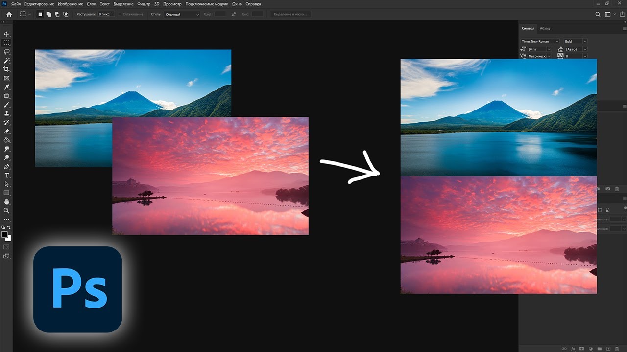 Как соединить две горизонтальные картинки в одну вертикальную автоматически в фотошопе
