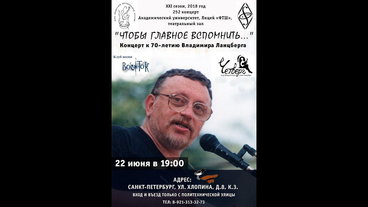 "Чтобы главное вспомнить..." к 70-летию Владимира Ланцберга. Запись Николая Алфёрова. Санкт-Петербург, ул.Хлопина, д. 8, к.3 Академический университет, лицей "ФТШ" Клуб "Доброхот" Участвуют исполнители из петербургских клубов "Восток", "Доброхотъ", "Парус" и "Четверг", а также гости из Москвы и Мурманска Видеозапись - Николай Алфёров Использованы фрагменты видеозаписи Аллы Левитан Запись и обработка звука - Дмитрий Зайцев 00:04:41 Видеофильм: Владимир Ланцберг. Рассказ о Саратове. 00:04:41 "Три квартала на Вольской" 00:28:56 "Дождь идёт" 00:52:49 "По Астраханской" Александр Колосов: 1:00:37 «Песенка наивных упрямцев» 1:04:39 «Зеленый поезд» 1:08:19 «Песенка о голове» Варвара Гарнюк: 1:11:28 «Алые паруса» Татьяна Черкасская: 1:14:15 «Не пейте сырой воды...» Андрей Михалевкин: 1:16:56 «Синева» Надежда Ишкулова: 1:22:34 «Тридцать третий румб» 1:24:17 «Пришёл отдавать долги…» 1:24:39 «Этюд об авторучке» Егор Захаров: 1:29:08 «Тот самый товарняк» Татьяна Черкасская: 1:31:49 «Когда бы то ни случилось…» Алексей Звягин 1:34:02 «Мне сообщили, что я не Пушкин…» 1:34:14 «Мой старенький Пегас» Татьяна Землеруб: 1:37:31 «Песенка о весне» Татьяна Черкасская: 1:39:25 «Между восьмым и девятым вагонами…» Иосиф Юсим: 1:41:14 «Неуверенный монолог» Видеофильм: Владимир Ланцберг на «Втором канале» 1:48:00 «Псков» (Евгений Клячкин) Алексей Дудин: 1:54:26 «Трубач» Евгения Ланцберг: 1:58:56 «Когда бы то ни случилось…» (начало) 1:59:18 «Великий русский писатель…» Валерий Чечет: 2:02:27 «Я оставлю тебе» 2:04:26 «Ртутное солнце» 2:06:39 «Прощание» Татьяна Черкасская: 2:08:58 «Мы не поверим, что умрём…» Дмитрий Коломенский 2:11:52 «Песенка с той стороны» Татьяна Черкасская: 2:15:35 «Есть такая песенка…» 2:16:00 «Песенка об условных знаках» 2:18:35 «Мышь в углу скребётся…» Лев Юфит (Таня Черкасская - стихи): 2:24:30 «Песенка за рупь-двадцать» София Попова 2:29:22 «Костёр у подножья» Елена Соколова 2:33:38 «Сказка с хорошим концом» Общая песня: 2:37:09 «Друзьям»