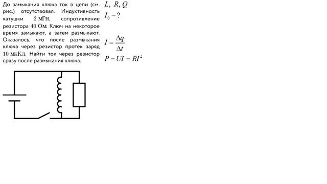 До замыкания ключа ток в цепи отсутствовал. Индуктивность катушки дана, сопротивление резистора тоже. Ключ на некоторое время замыкают, а затем размыкают. Оказалось, что после размыкания ключа через резистор протекло известное количество заряда. Нужно найти ток резистора сразу после размыкания ключа.