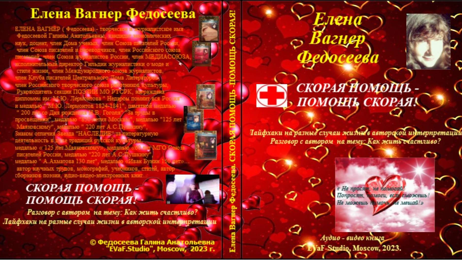 Helena Vagner Fedoseeva Порадуемся! Еще одна премьера! Анонс на ютубе, дзен, рутуб! АУДИОКНИГУ МОЖНО ПРИОБРЕСТИ! Елена Вагнер Федосеева СКОРАЯ ПОМОЩЬ - ПОМОЩЬ СКОРАЯ! Часть 1.Не просят, не помогай! Лайфхаки на разные случаи жизни в авторской интерпретации Разговор с автором на тему: Как жить счастливо? « Не просят, не помогай! Попросят, помоги, если сможешь! Не можешь помочь, не мешай!» Аудио& видео книга. EVaF-Studio, Moscow, 2023. От автора: Доброго времени суток, дорогие единомышленники! Представляю Вам свою новую аудио-видео книгу «СКОРАЯ ПОМОЩЬ - ПОМОЩЬ СКОРАЯ!» В книге содержатся актуальные для каждого из нас советы, методики, способы, медитации и технологии, которые позволят нам справиться с различными жизненными ситуациями, которые вызывают у нас беспокойство и неудовлетворенность жизнью. Они позволят нам жить более яркой, насыщенной и счастливой жизнью! Конечно, для того, чтобы все эти прогнозы воплотились в жизнь, необходимо изменить свой менталитет, используя предлагаемые лайфхаки, жить более осознанно, не на «автомате». Я просто делюсь опытом жизни и учусь вместе с Вами жить более счастливо и полноценно! Предлагаю совершенствоваться вместе! Мир меняется на наших глазах самым кардинальным образом, происходит явное сближение и взаимопроникновение земного, плотного мира с мирами тонкими. Явления, порой не объяснимые с научной точки зрения, становятся нашей реальностью. Необходимо подготовить свое сознание к новому мировосприятию и жизни в новых изменившихся условиях. Буквально на наших глазах происходит крах старого мира и возникновение нового, с новыми законами взаимодействия между людьми и природой. В подарок вам - комплексные медитации для формирования нового, многомерного сознания человека Новой Эпохи Водолея. Сочетание научных и эзотерических знаний и информации дают синергетический эффект продвижения на Пути эволюции. Не для этого ли мы все здесь сейчас собрались? Как подготовить свое сознание к жизни в Новом мире? Как помочь своему организму настроиться на более высокие вибрации? Об этом и многом другом данная аудио-видео-книга, которая, кстати, существует только в аудио-видео-вариантах. Ситуационные медитации Вам в подарок! Книгу можно приобрести в личное пользование и находиться в процессе трансформации и преображения сознания круглосуточно вне зависимости от наличия доступа к Интернету! Вдохновляю Вас на успех в процессе преображения и трансформации сознания! С Любовью, ЕВФ. Содержание Часть 1.Не просят, не помогай! 1. Как сохранить себя в ресурсе? 2. Как перестать ревновать? 3. Как бережно поддержать близкого человека ( слова поддержки!) 4. Схема выхода из выгорания. 5. Шаги, которые помогут Вам решить любую проблему! 6. Признаки надежных отношений с самим собой. 7. Любите ли Вы себя ( критерии)? 8. Признаки любви «Нарцисса». Вы «Нарцисс»? 9. Признаки токсичных отношений. Пути выхода из них. 10. Как энергия человека исполняет желания. 11. Полезные советы на каждый день. 12. Полезные и мощные установки на каждый день + Медитация. 13. Укрепление личных границ или «Иди-ка ты на три буквы, дурак!» + Медитация на укрепление личных границ. 14. Как понять, что личные границы нарушены? Чем грозит? Что делать?+ Медитация на построение личных границ.. 15. Советы идущему по Пути. Ангельская медитация. 16. Законы разума и духовное развитие + МЕДИТАЦИЯ для духовного р