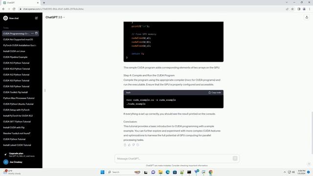 Download this code from https://codegive.com Title: Getting Started with CUDA Programming: A Simple Example Introduction: CUDA (Compute Unified Device Architecture) is a parallel computing platform and programming model developed by NVIDIA for general-purpose computing on GPUs (Graphics Processing Units). It allows developers to harness the computational power of GPUs to accelerate applications. In this tutorial, we'll walk through a simple CUDA example to demonstrate how to offload computation to the GPU. Prerequisites: Step 1: Install CUDA Toolkit Download and install the CUDA Toolkit from the official NVIDIA website (https://developer.nvidia.com/cuda-downloads). Follow the installation instructions provided for your specific operating system. Step 2: Set Up the Development Environment Create a new CUDA project in your preferred code editor or IDE. Ensure that the CUDA Toolkit is properly configured, and the necessary paths are set. Step 3: Write a Simple CUDA Program Create a new CUDA source file (e.g., cuda_example.cu) and add the following code: This simple CUDA program adds corresponding elements of two arrays on the GPU. Step 4: Compile and Run the CUDA Program Compile the program using the appropriate compiler (nvcc for CUDA programs) and run the executable. Ensure that the GPU is properly configured and accessible. If everything is set up correctly, you should see the result printed on the console. Conclusion: This tutorial provides a basic introduction to CUDA programming with a simple example. You can further explore and experiment with more complex CUDA features and optimizations to harness the full potential of GPU computing for parallel processing tasks. ChatGPT