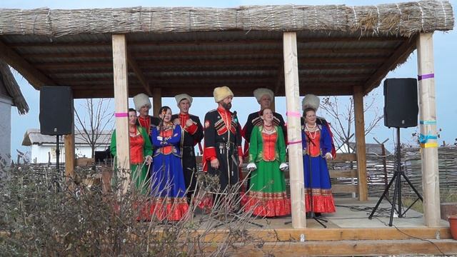 Выступление народного ансамбля казачьей песни "Колос" на подворье Тихорецкого района в этно-станице Атамань перед гостями.