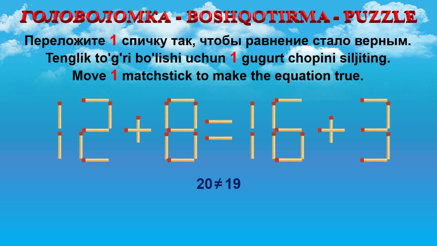 ГОЛОВОЛОМКА - BOSHQOTIRMA – PUZZLE. Спичка. 12+8=16+3, 10+9=12+8, 12+5=13+6, 14+8=12+9