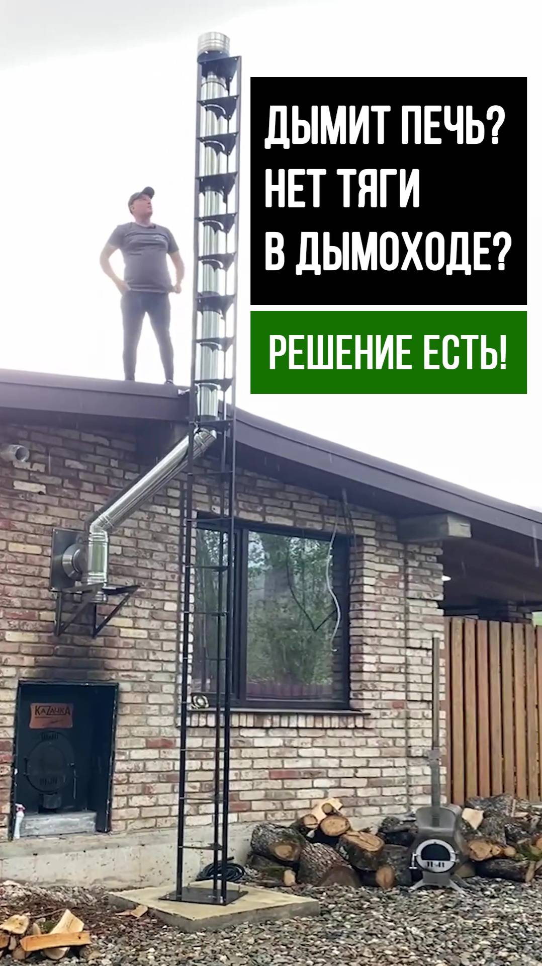 Низкий дымоход причина отсутствия тяги, о чем говорит закопченая стена. Установка мачты позволила увеличить дымоход для обеспечения стабильной тяги при горении. Мачта обеспечивает устойчивость конструкции и исключает воздействие на кровлю здания. Официальный сайт: pech-pobelomu.ru. Телефон +7 (918) 485-42-63, WhatsApp +7 (918) 996-31-05.