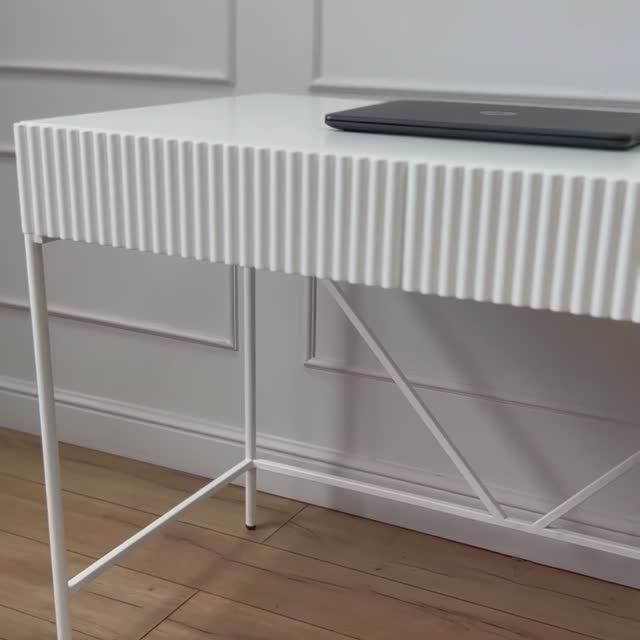 Строгий и лаконичный стол письменный с двумя выдвижными ящиками на металлическом основании из коллекции дизайнерской мебели Velvet выполнен в современном стиле. Корпус и фасад стола из МДФ покрыты белой матовой эмалью в 3 слоя по всем техническим стандартам (что значительно продлевает срок службы изделия) и имеет глубокий насыщенный цвет, выдерживает больший перепад температур. Цвет по каталогу RAL 9003. Доставка в собранном виде! Основание металлическое в полимерной покраске Белый. Регулируемые подпятники. Выдвижные ящики полки ЛДСП белого цвета. Направляющие скрытого монтажа с доводчиком плавного закрывания. Ящики открываются захватом снизу. На фасаде оригинальная фрезеровка в виде волны без острых углов. Письменный стол можно использовать в качестве стола для ноутбука или как компьютерный стол. Многофункциональный рабочий стол преобразит дизайн вашей комнаты или кабинета, добавит изящности. Станет отличным дополнением в интерьер спальни, гостиной или в коридор и украсит ваш дом. Также подойдет в детскую как школьный стол, для офиса в кабинет руководителя и в салон красоты. Замечательный подарок искушенным коллегам, друзьям и близким. Современный столик консоль впишется во многие стили дизайна, в том числе и в лофт. Размеры: ширина 104 см. глубина 60 см. высота 76 см. Интерьерная мебель от фабрики Гранд Хауз, идеальное решение для вашего дома. Ссылка на товар: clck.ru/3SGXqp Подписывайтесь на канал, чтобы не пропустить новинки! Сайт: grandehouse.ru Группа VK: vk.com/grandehouse_mebel
