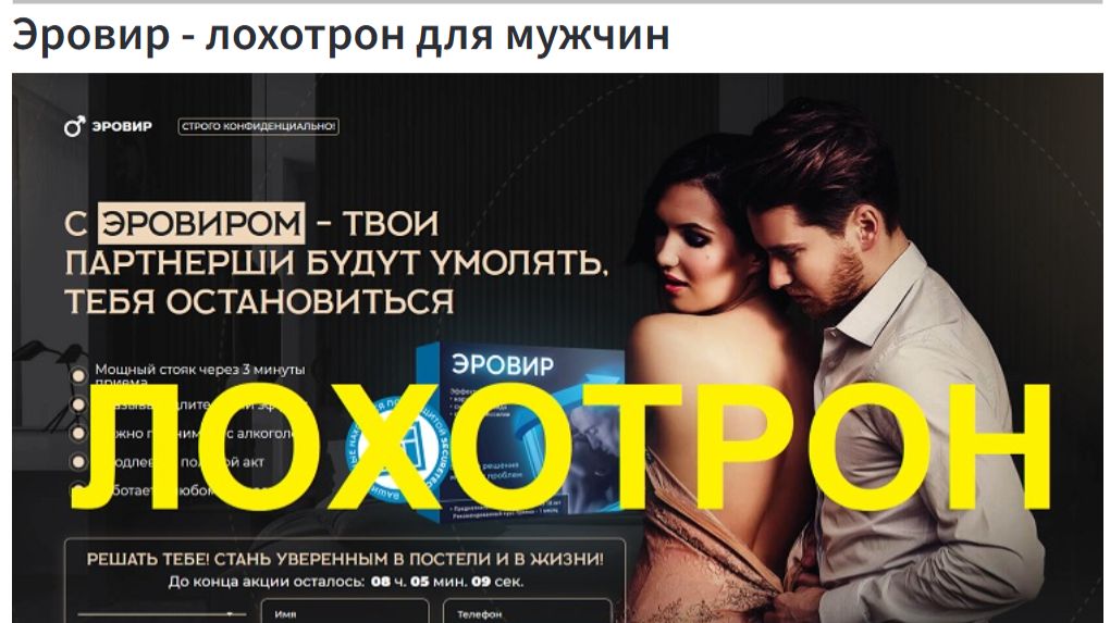 Тема снижения мужской силы популярная, рано или поздно касающаяся всех мужчин и от того в целевой аудитории недостатка не будет никогда. И вот вы попадаете на сайт, где предлагают эту щекотливую проблему решать за раз. Есть и восторженные отзывы и мнение врача-специалиста. Только вот формы для добавления отзывов попросту нет нигде не сайте! Куда писать-то и как? Привлекает и волшебная "бесплатность", влекущая мужчин как свет - ночных мотыльков. Увы, бесплатно вы ничего не получите, схема эта давно обкатана. Сначала вы обязаны заказать и выкупить некий "полный курс Эровир". Как ни удивительно, его длительность (соответственно - стоимость) определит там телефонный оператор мошенников по телефону. Просто так, на глазок... Одно будет совершенно точно, жулик постарается раскрутить клиента на максимально возможную сумму! В среднем афера начинается с 4-7 тысяч рублей и может достигать десятков тысяч. И вот потом одну пилюльку вы и получите в качестве презента. Вот такая "бесплатность" будет на деле. Конечно, было бы крайне любопытно знать, какая цена Эровир в аптеках, для сравнения цен... Но, увы - аптеки не торгуют разной бодягой без единого документа... На самом сайте - куча бреда, от простых выдумок, выдаваемых за правду, до откровенной лжи. Схема развода давно мошенниками обкатана - грошовую пищевую добаку наделяют целебными свойствами и продают за бешенные деньги.